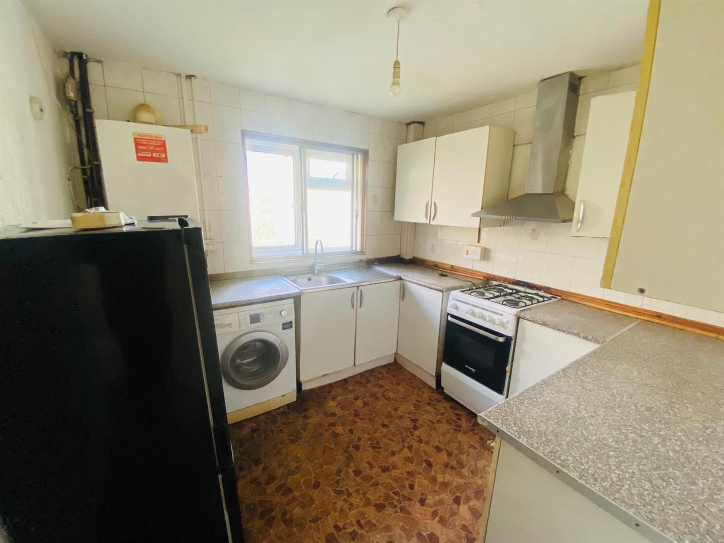 Kitchen - Single drainer stainless steel sink unit with mixer tap and cupboard below, further range of wall and floor mounted units, space for cooker, washing machine and fridge, wall mounted boiler, double glazed window.