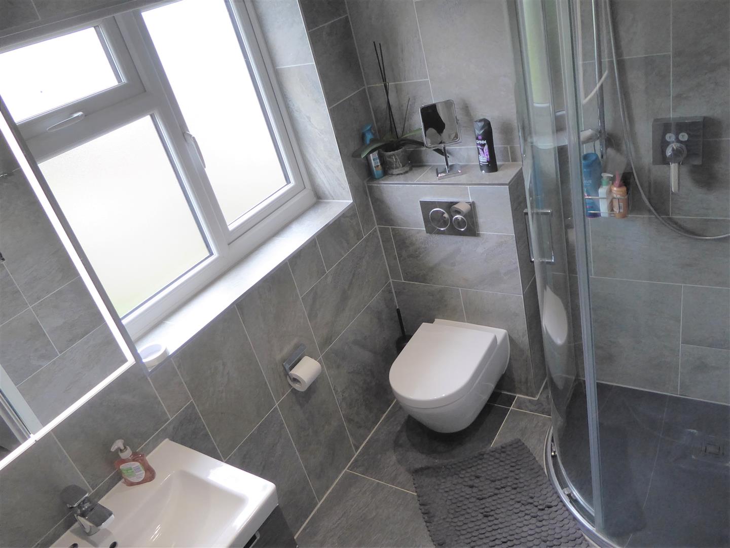 Modern Re-Fitted Shower Room - Tiled enclosed shower cubicle, wash hand basin with vanity unit below, low level w/c, part tiled walls and flooring, double glazed windows, heated towel rail.