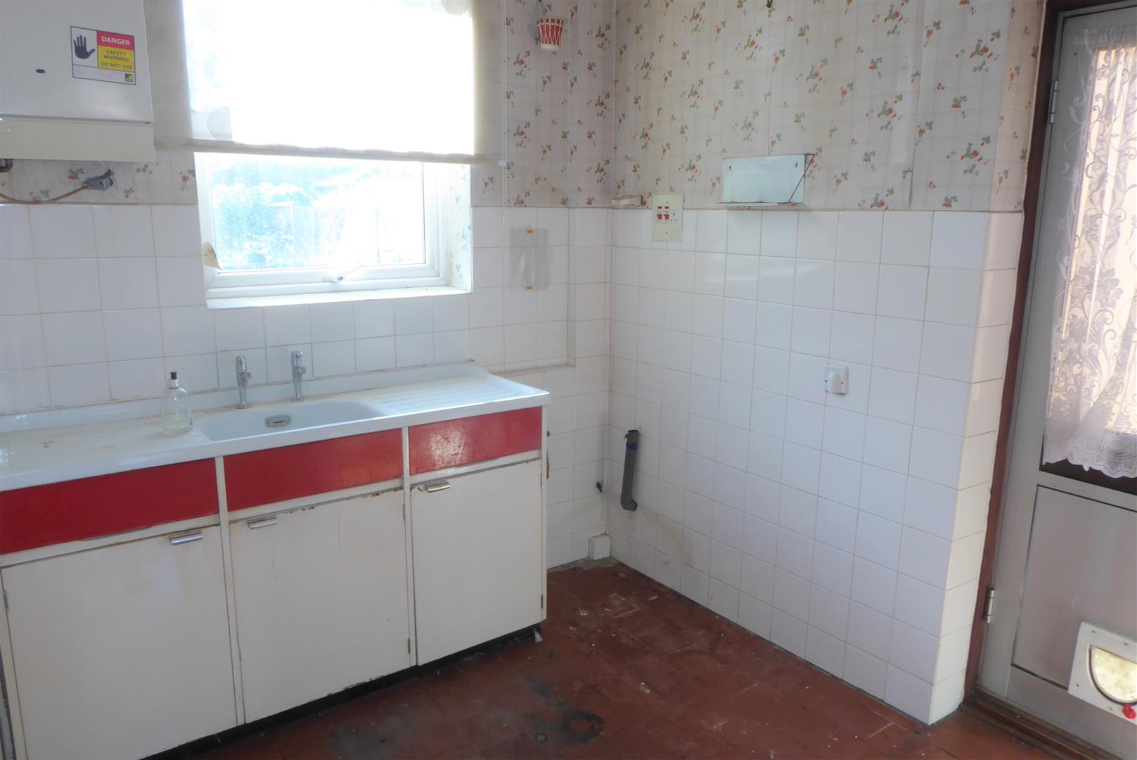 Kitchen - Double drainer sink with cupboard below, wall mounted boiler, storage cupboard housing fuse box, tiled flooring, rear aspect double glazed window, door to garden.