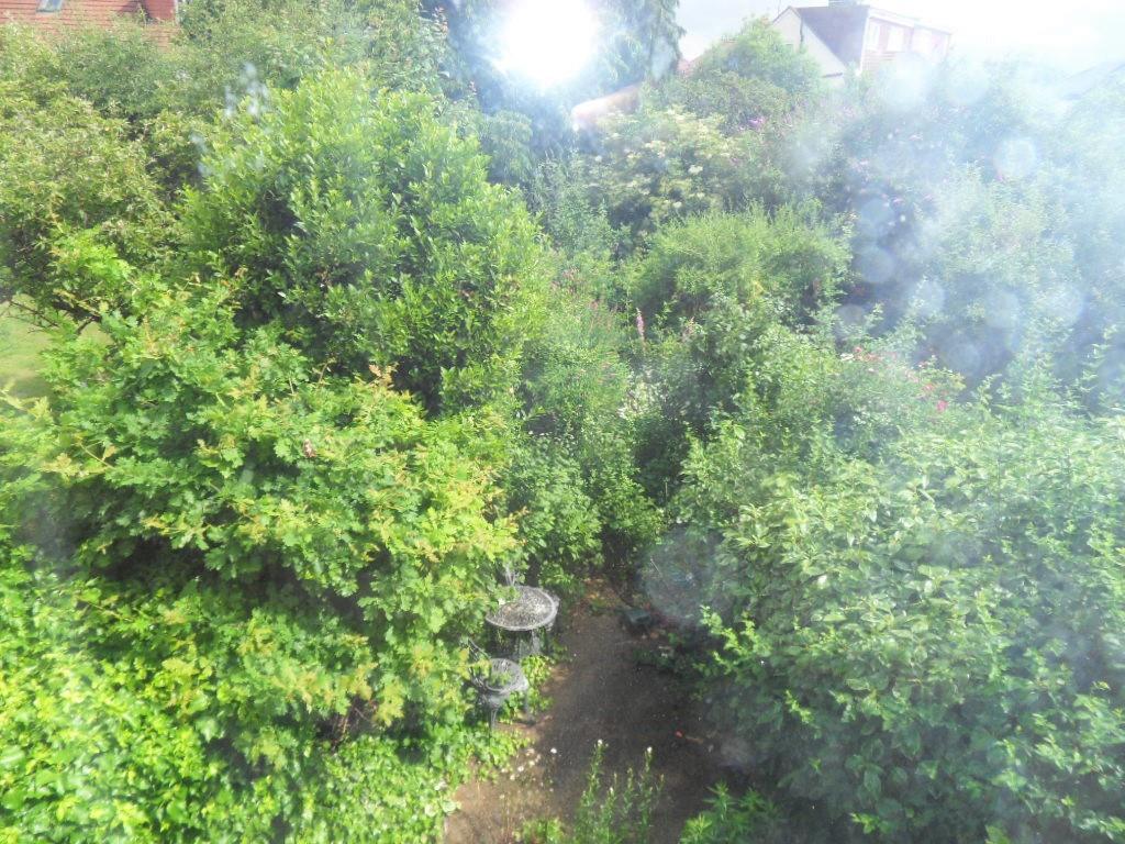Rear Garden - Patio area with a variety of shrubs in need of cultivation.
