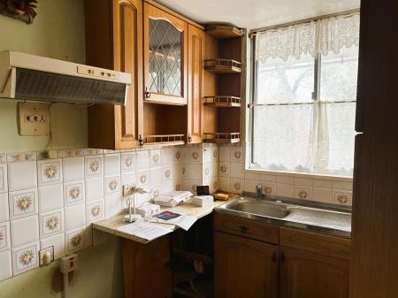 Kitchen - Single drainer stainless steel sink unit with mixer tap and cupboard below, further wall and floor mounted units, part tiled walls, space for cooker and washing machine.