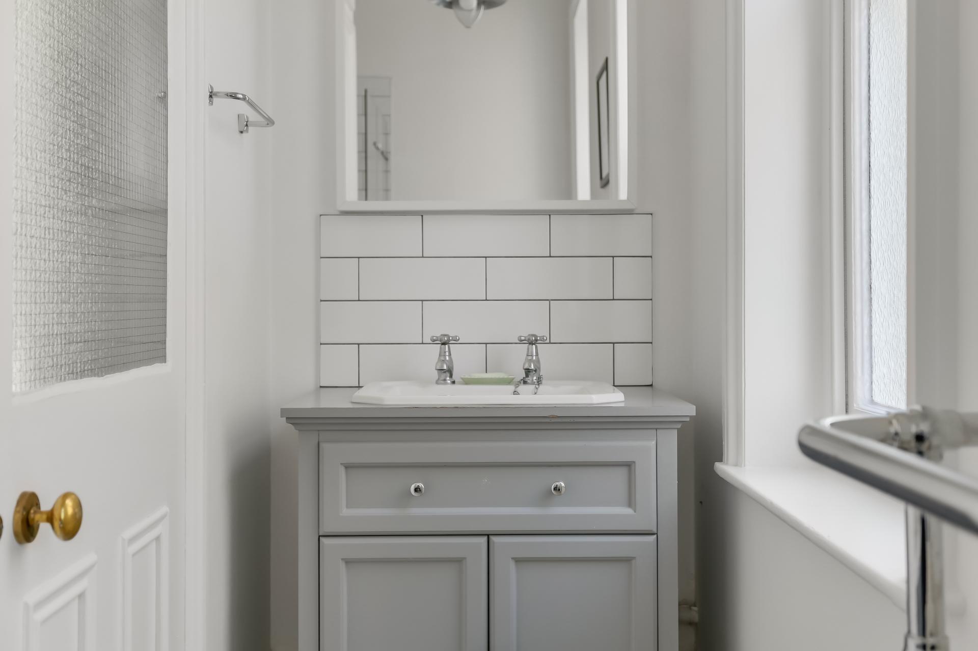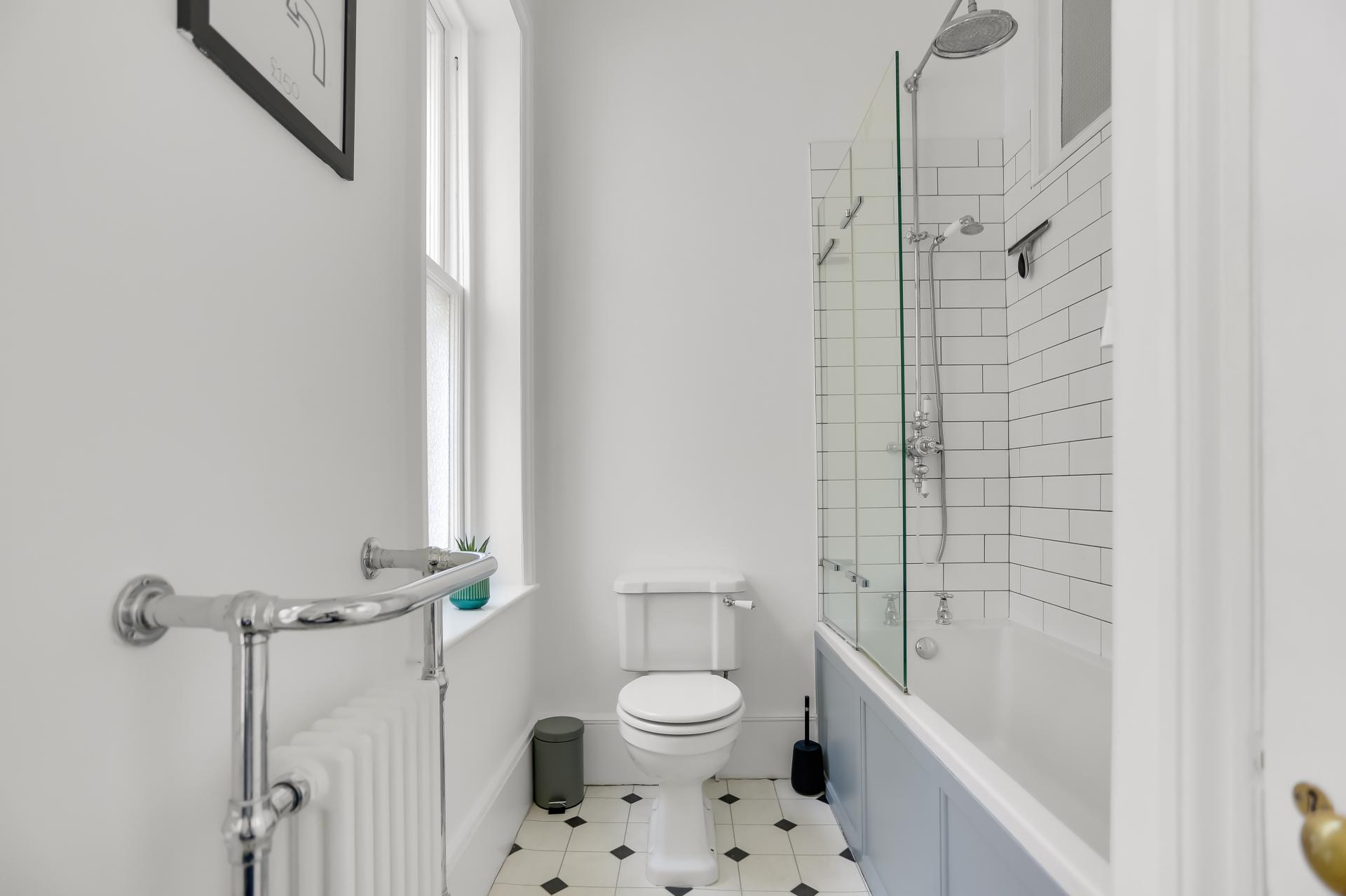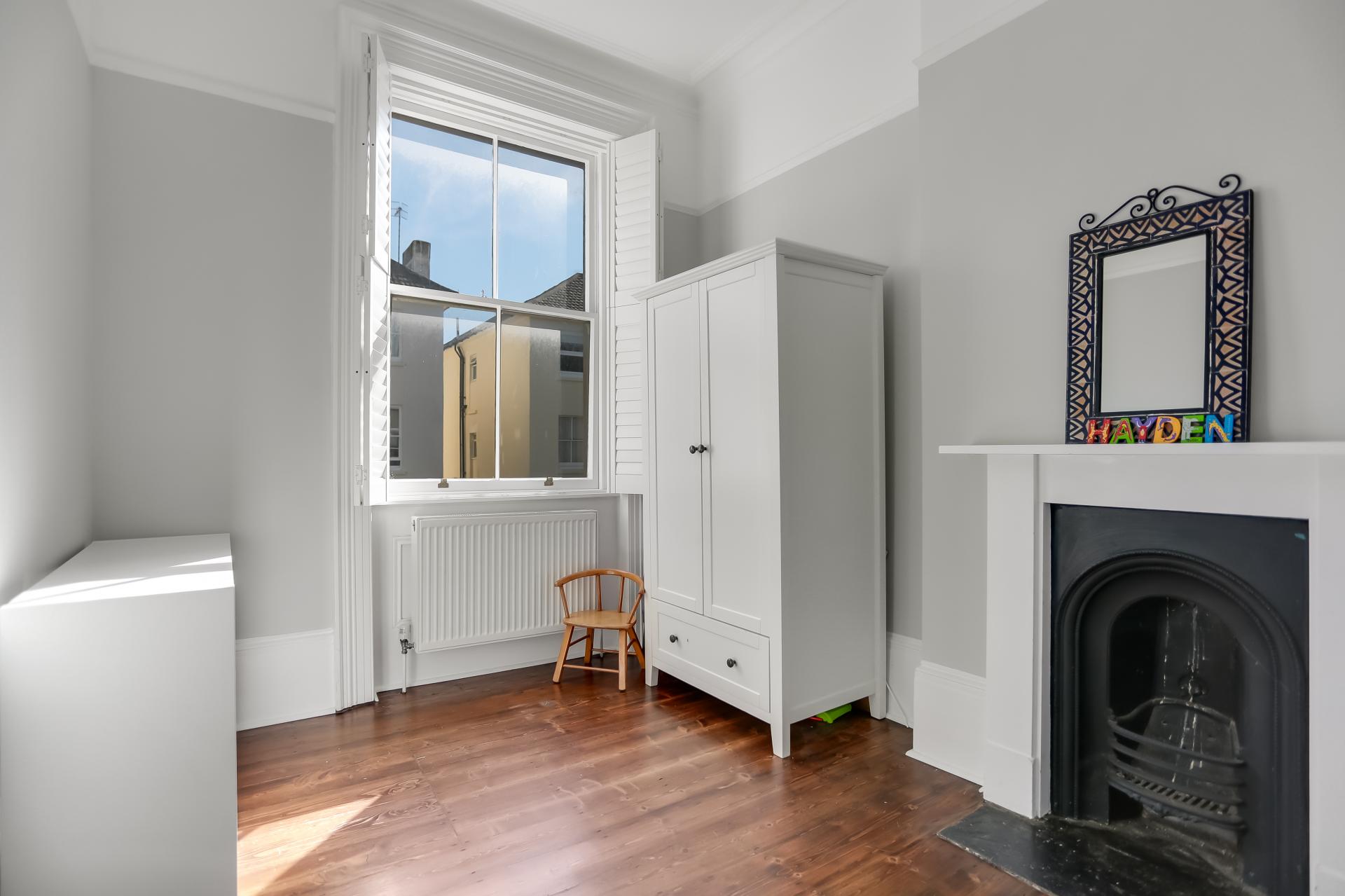 There are two spacious double bedrooms: the principal bedroom benefits from contemporary fitted wardrobes, while the second retains a delightful period fireplace. The property is completed by a well-appointed bathroom with a shower over the bath.