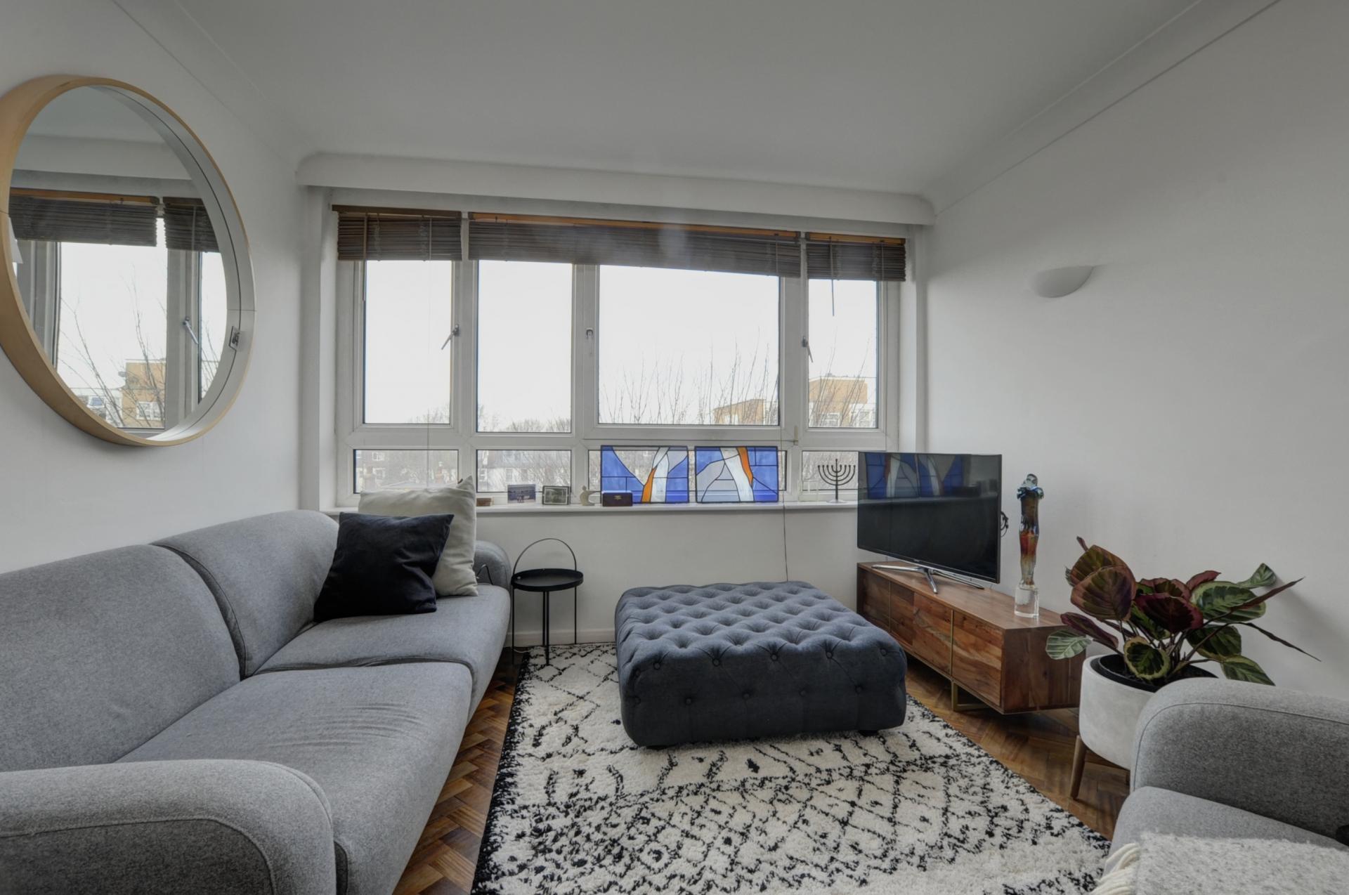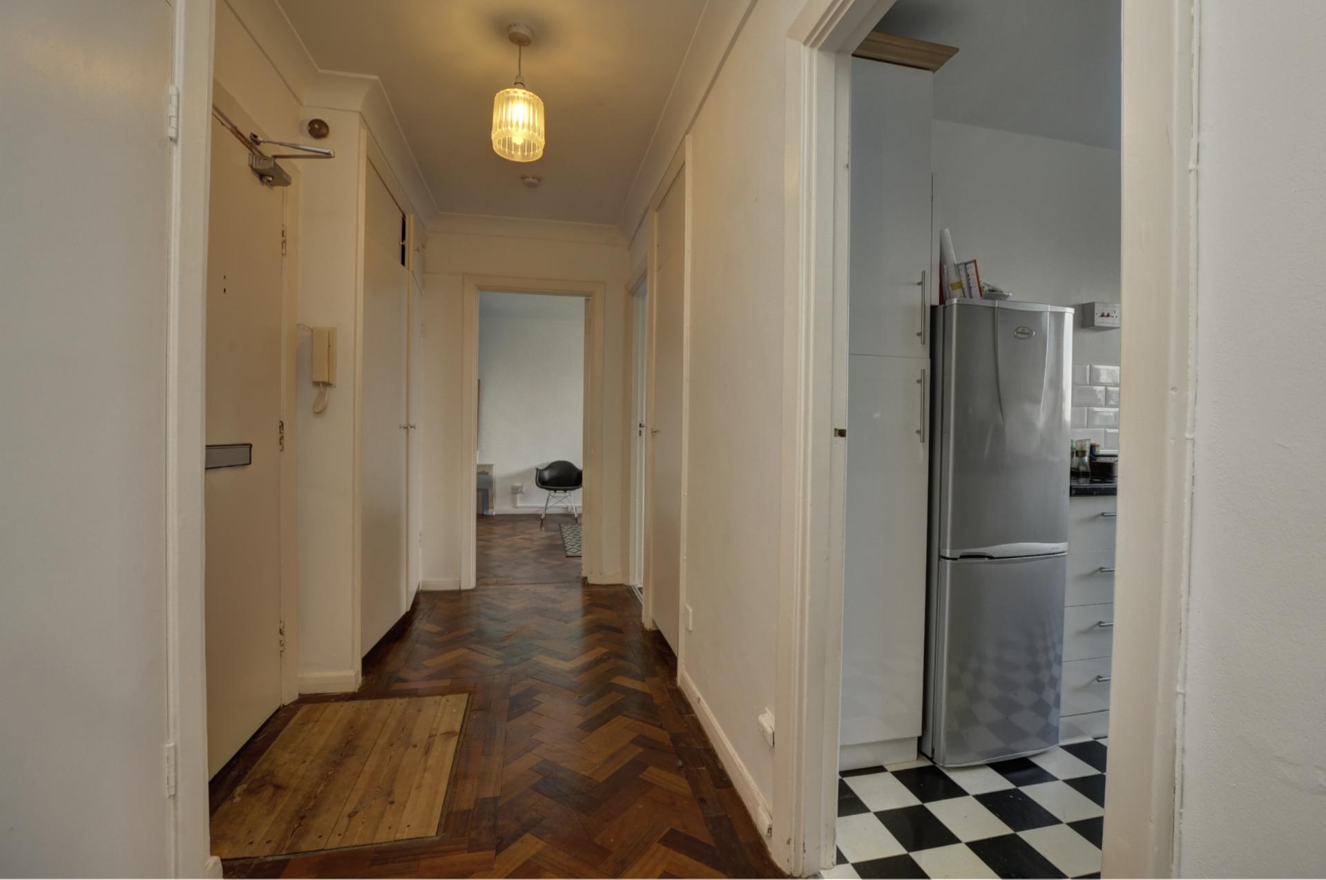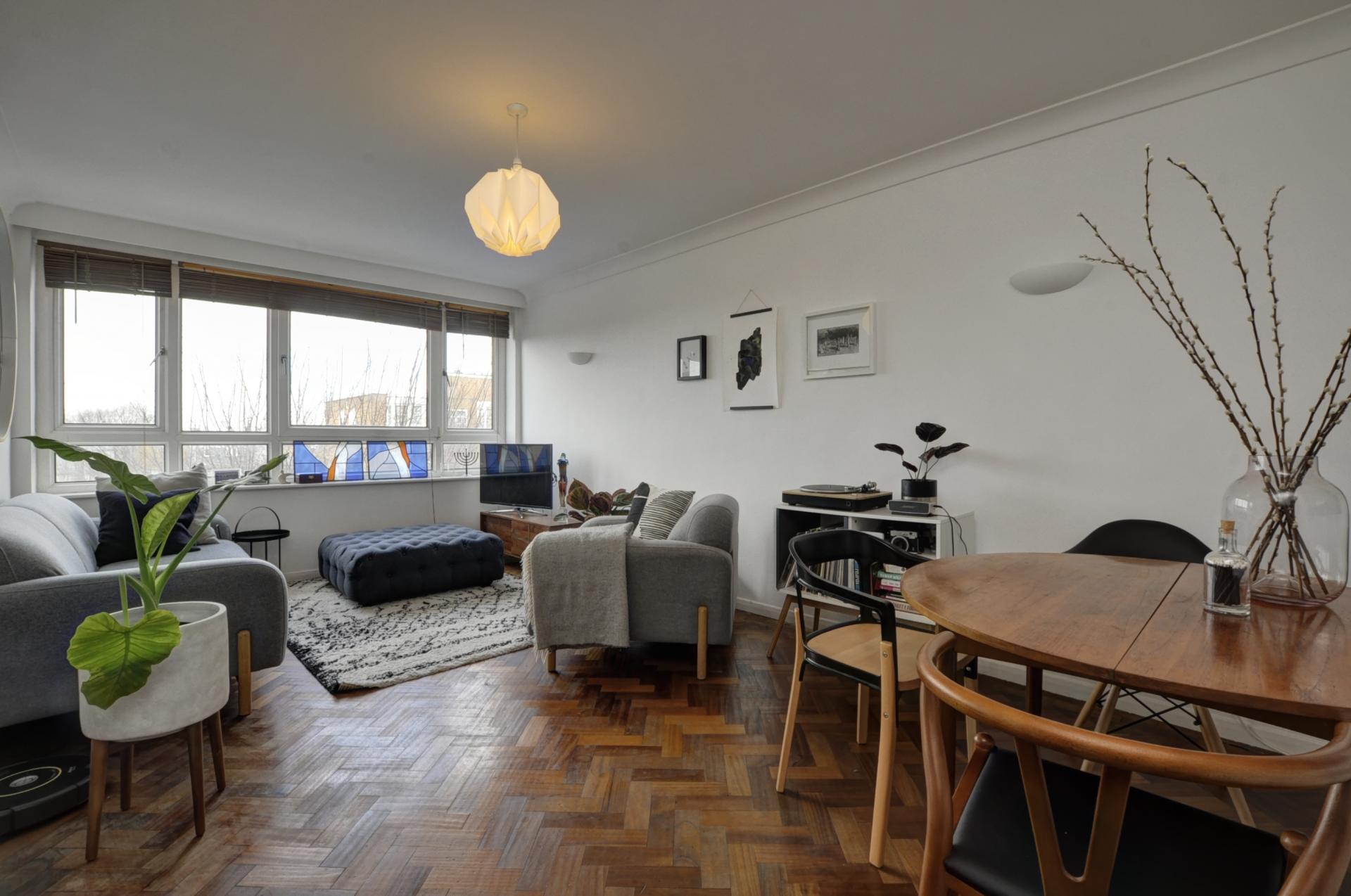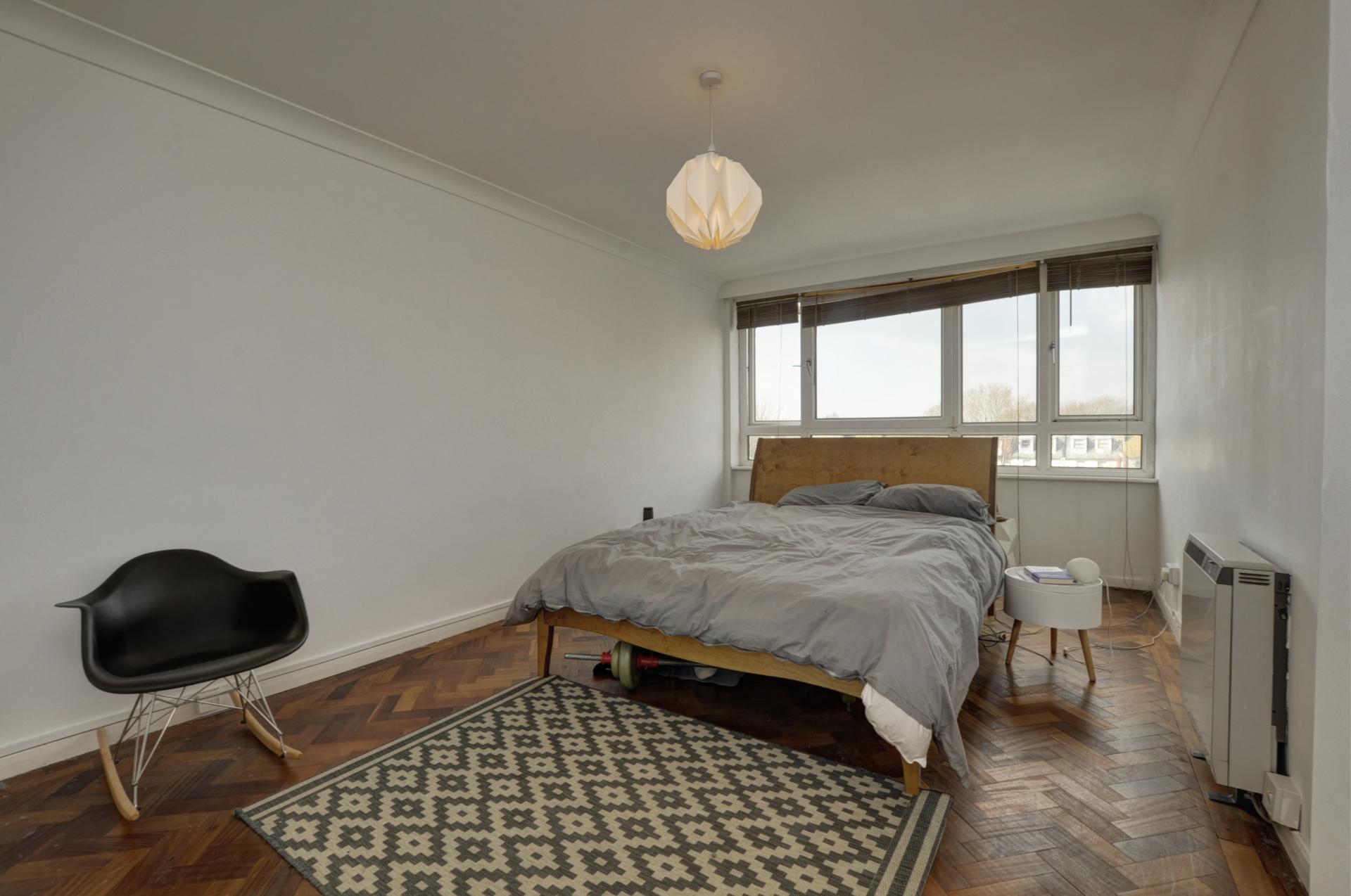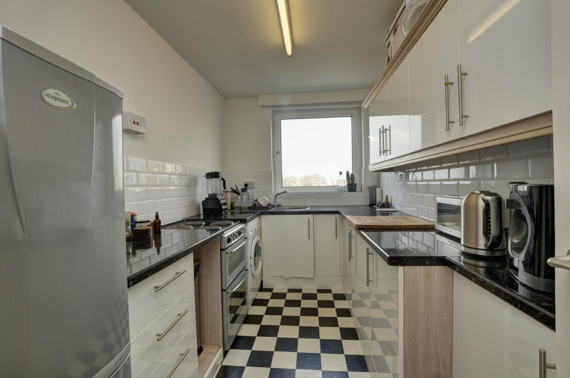 Positioned on the fourth floor of this well-maintained building, this apartment benefits from convenient lift access and features attractive parquet flooring throughout. The lounge/diner enjoys expansive windows that span the width of the room, creating a bright and inviting atmosphere. The separate kitchen offers practical storage solutions with its array of cupboards and counter space.