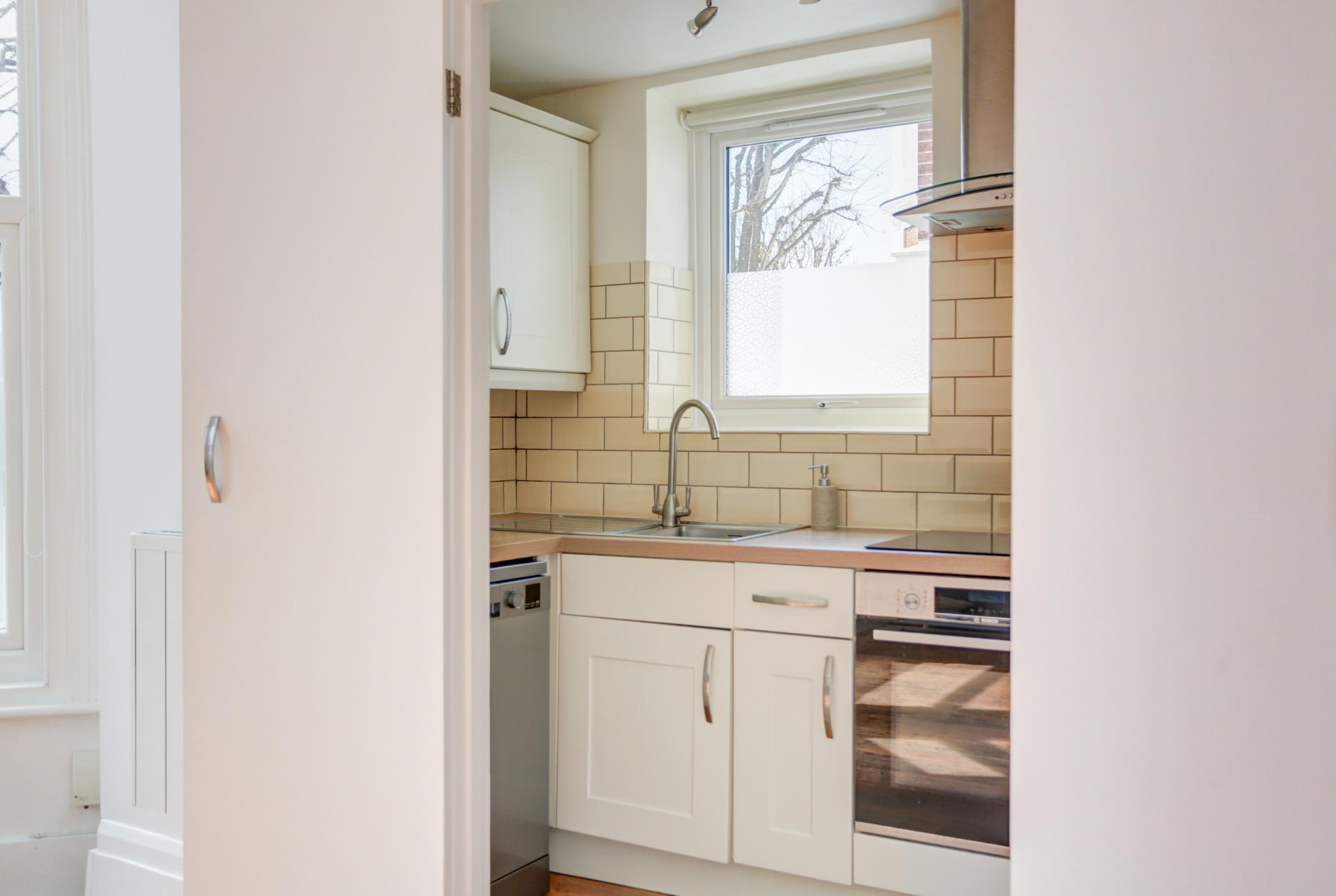 Set on the ground floor of an attractive period building, the apartment is wonderfully light and enjoys lofty ceiling heights which have the added benefit of sound proofing. The living space is a good-size boasting a large bay window and plenty of discreet built-in storage. There is a separate modern fitted kitchen with a window and a contemporary shower room.