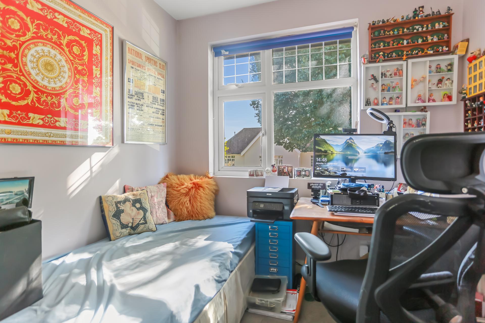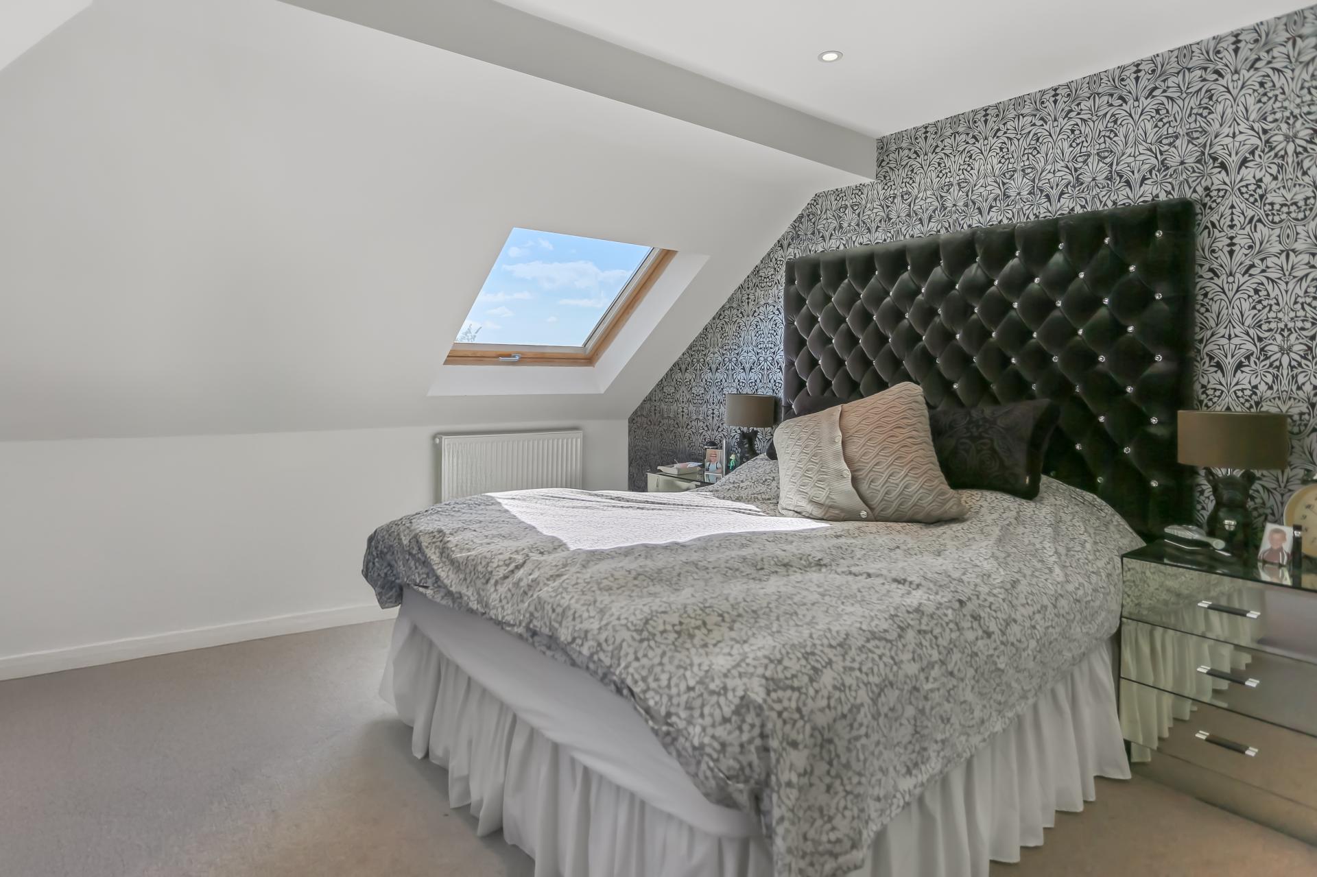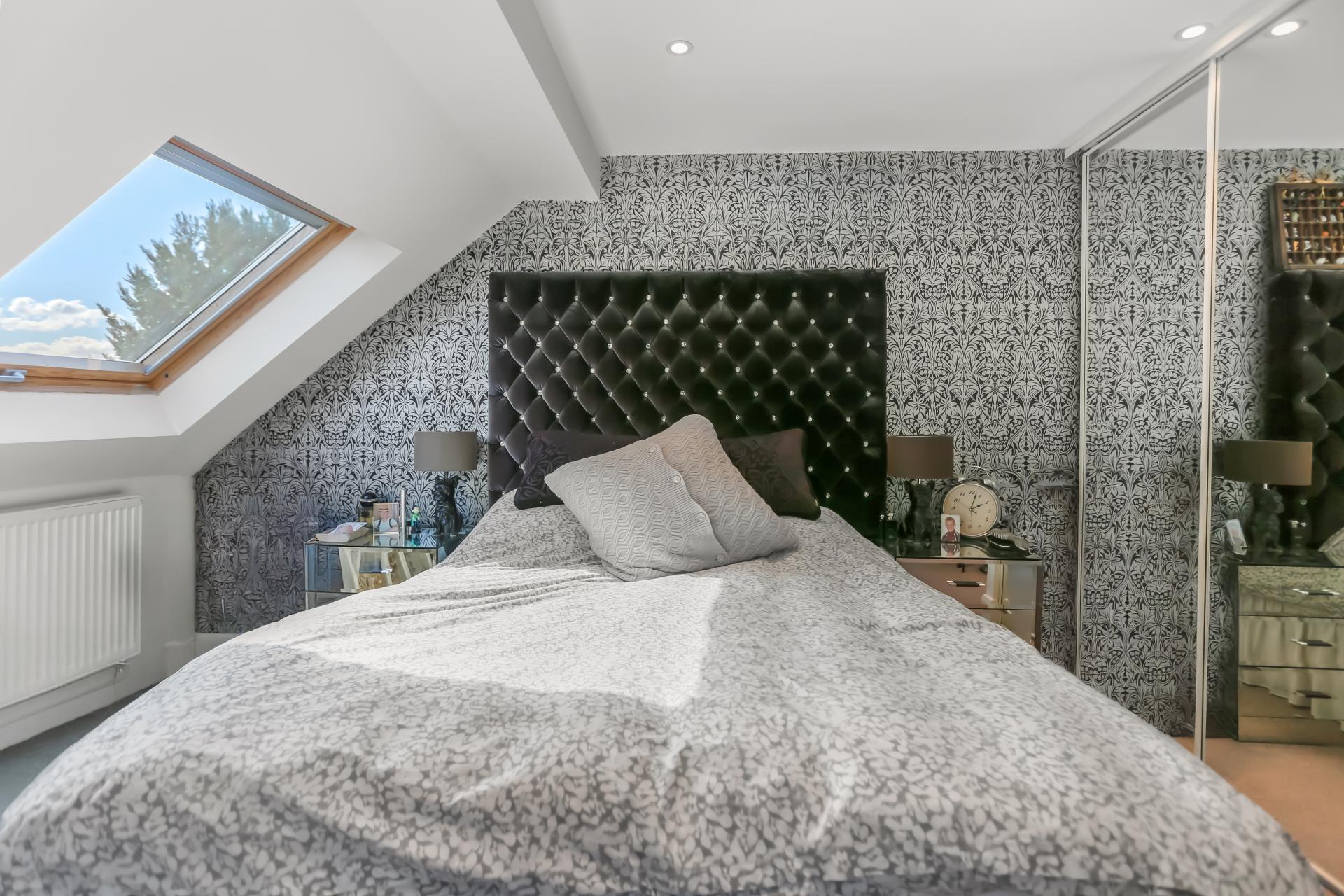 As you walk upstairs, a striking geometric stained-glass window adds character and an eye-catching detail. From the bright landing, there are two double bedrooms, the largest of which includes fitted wardrobes, together with a third bedroom and family bathroom. The top floor is dedicated to the principal suite, complete with mirrored fitted wardrobes, a modern en-suite shower room, and plenty of eave storage.