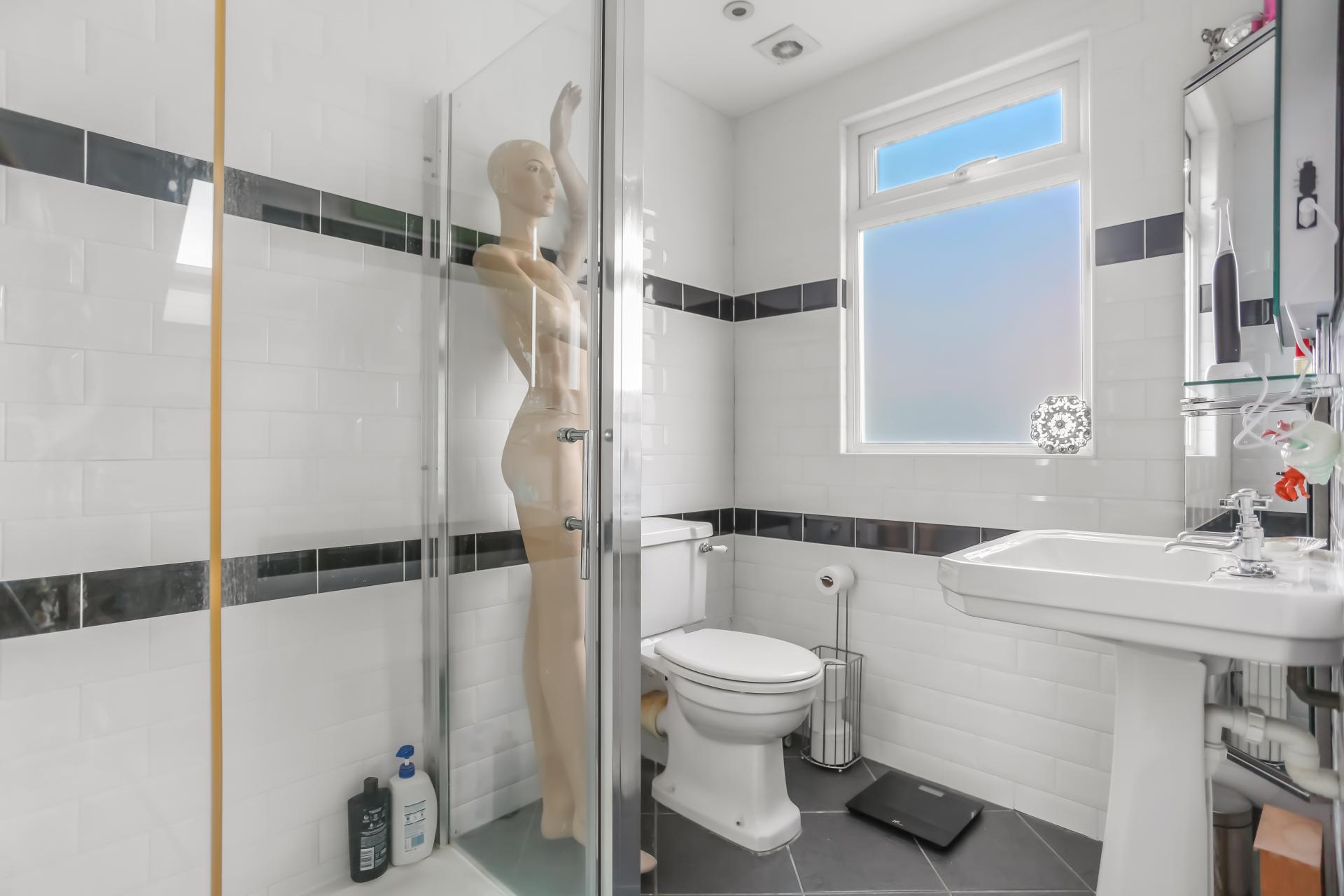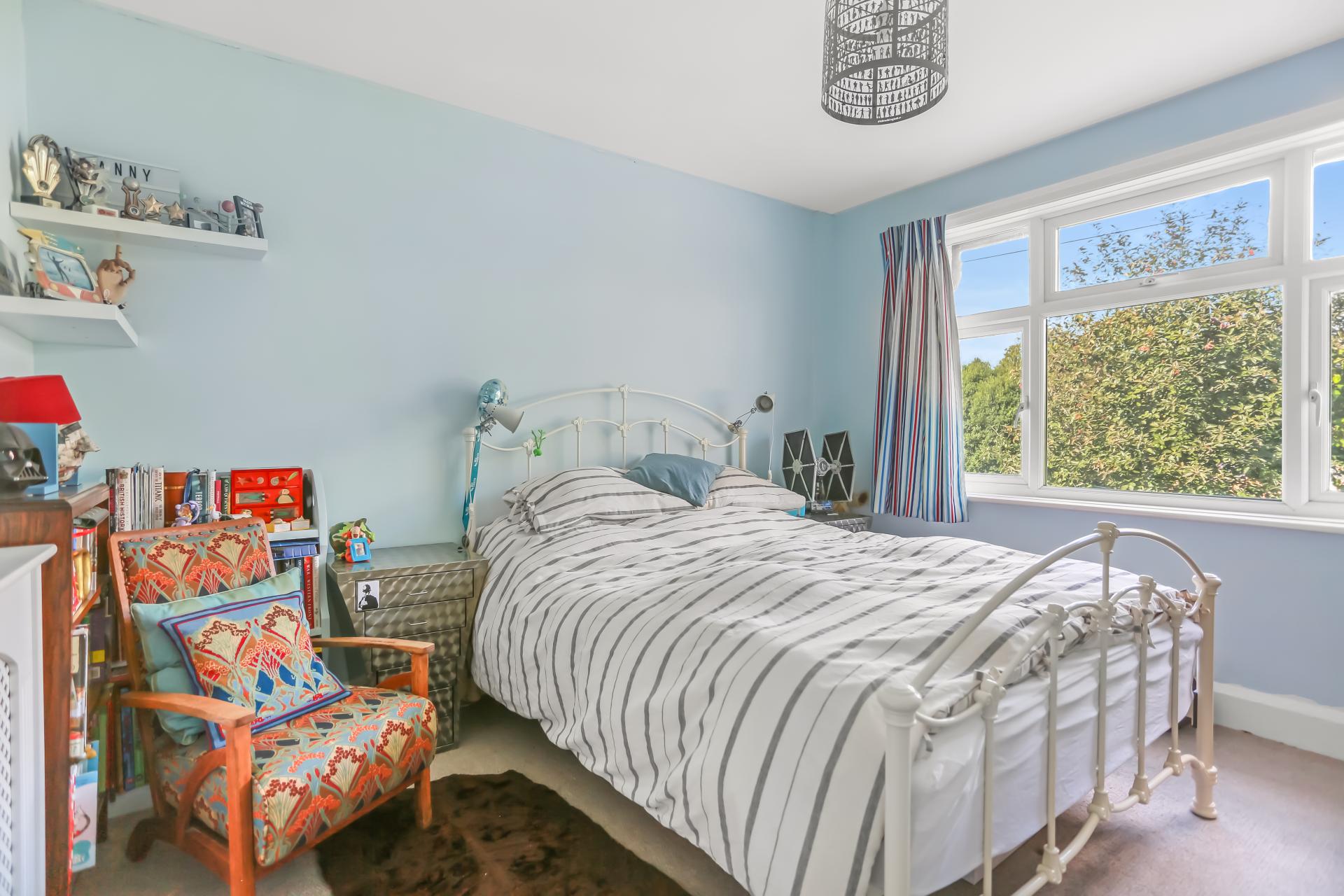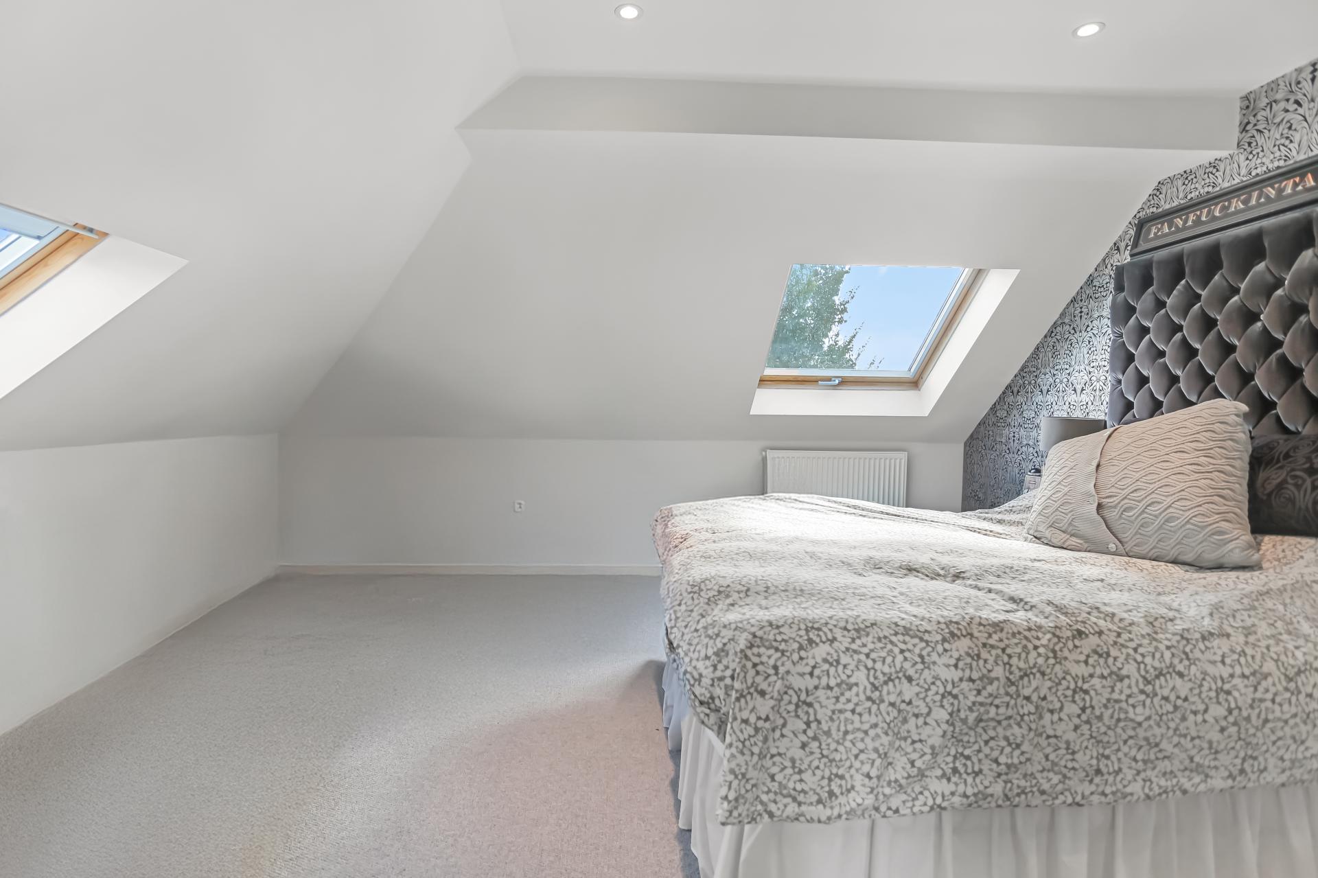 As you walk upstairs, a striking geometric stained-glass window adds character and an eye-catching detail. From the bright landing, there are two double bedrooms, the largest of which includes fitted wardrobes, together with a third bedroom and family bathroom. The top floor is dedicated to the principal suite, complete with mirrored fitted wardrobes, a modern en-suite shower room, and plenty of eave storage.