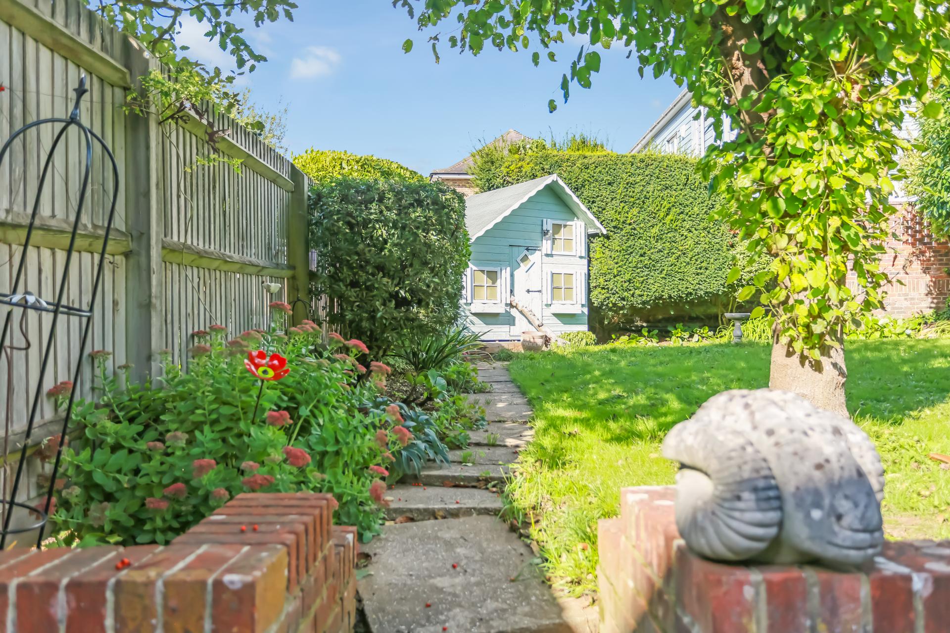 A wonderful rear garden offers a patio space perfect for family BBQs and a sizeable lawn with borders, a shed, and a charming playhouse. The property has been adapted to include a handy EV charging port.