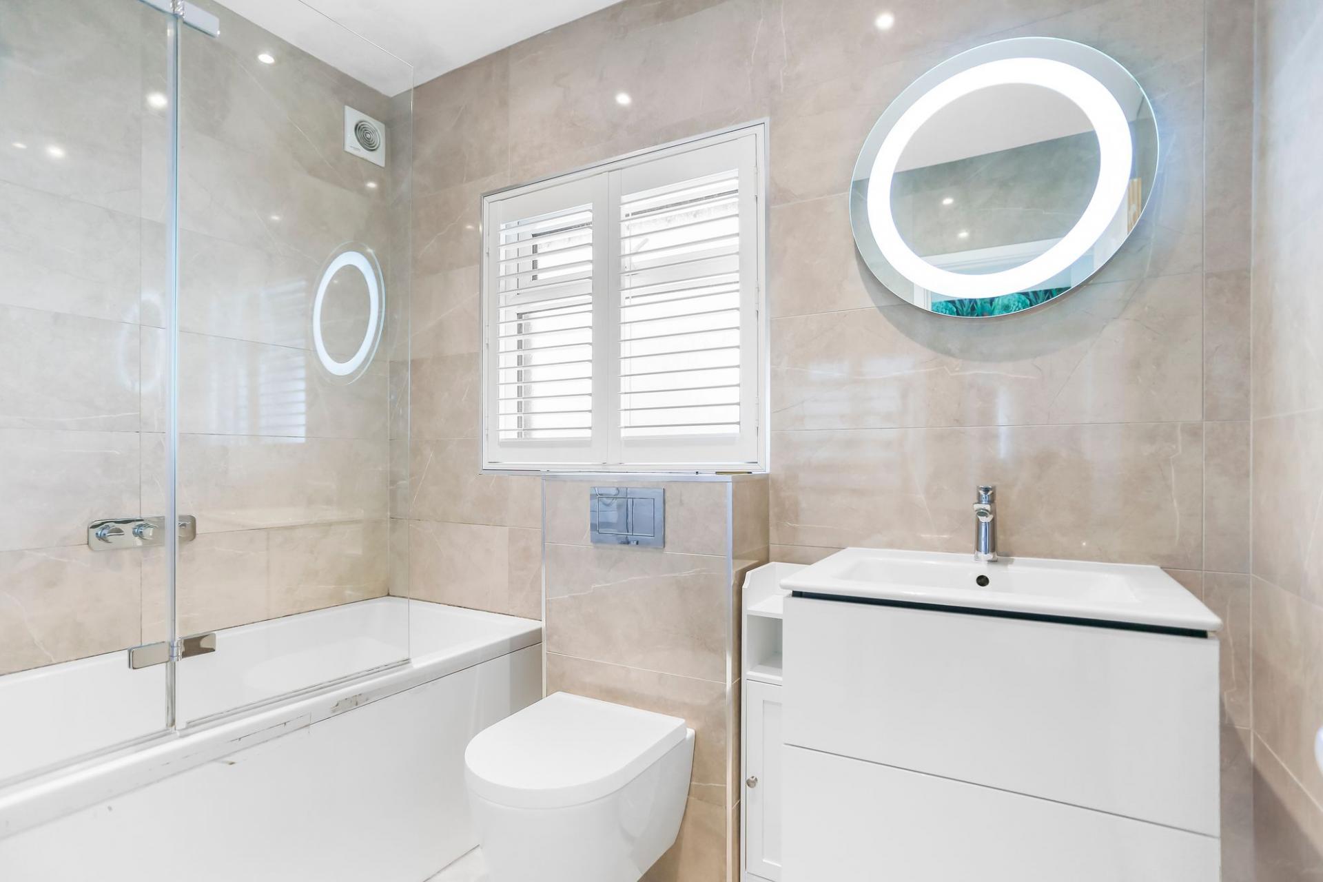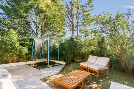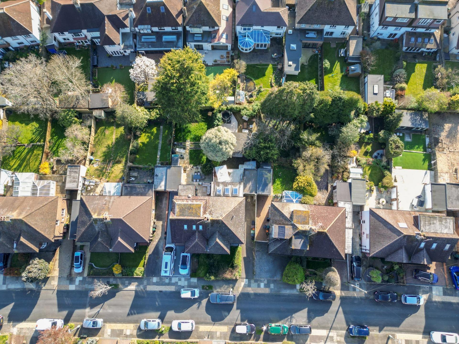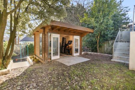 Outside, the west-facing garden provides an ideal setting for relaxing, dining, and entertaining. A spacious terrace with contemporary glass balustrades extends seamlessly from the kitchen/diner, with steps leading down to a secluded garden. The space features a well-balanced mix of lawn, decking, and paved areas. Additionally, there is a substantial garden room, currently used as a home gym, that offers excellent versatility as a home office or studio. There is a garage and a driveway with room for three vehicles.