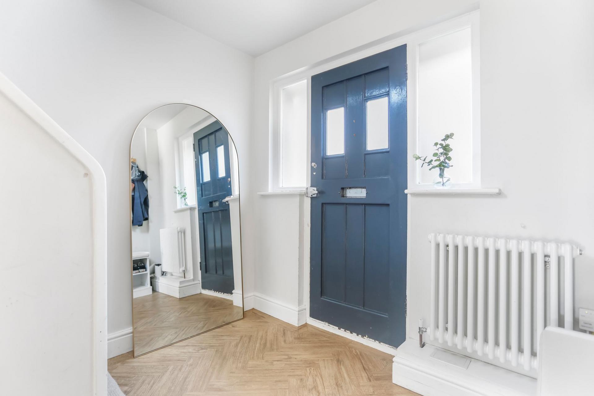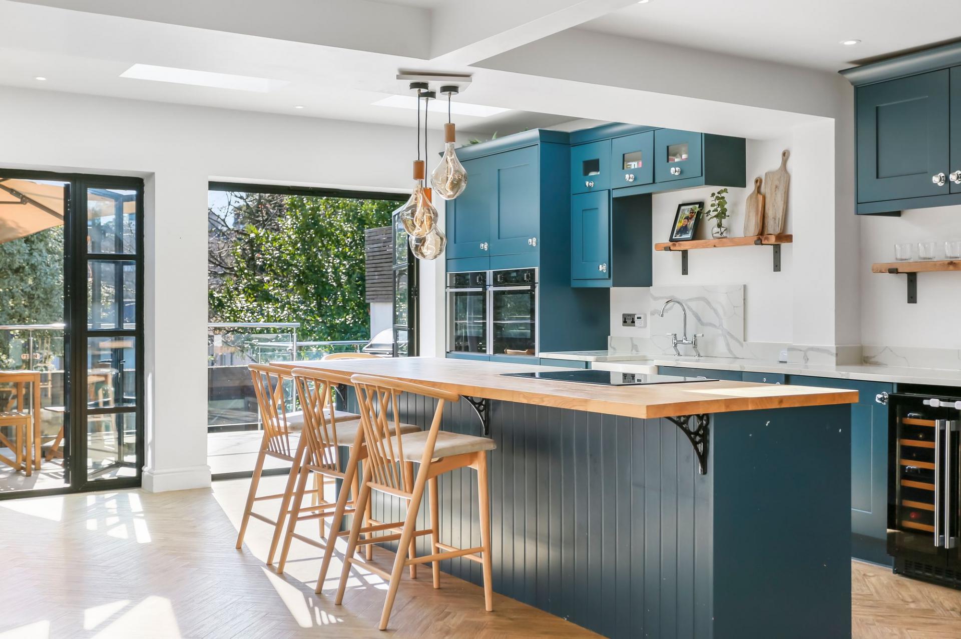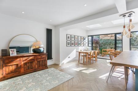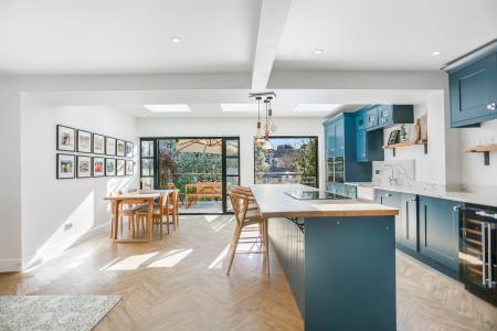 This lovely family home is well-designed and has an easy-flowing layout. The substantial kitchen/diner is truly the heart of the home. With Crittal-style doors leading to a sunny terrace, perfect for everyday outdoor dining or entertaining, skylights that flood the room with natural daylight and a fully fitted Shaker kitchen in a contemporary blue hue, it is perfect for modern living. A separate living room flows from the kitchen/diner, bringing the space together while remaining clearly divided. A downstairs cloakroom also serves the ground floor. On the first floor, there are three double bedrooms, two with fitted wardrobes and a family bathroom.