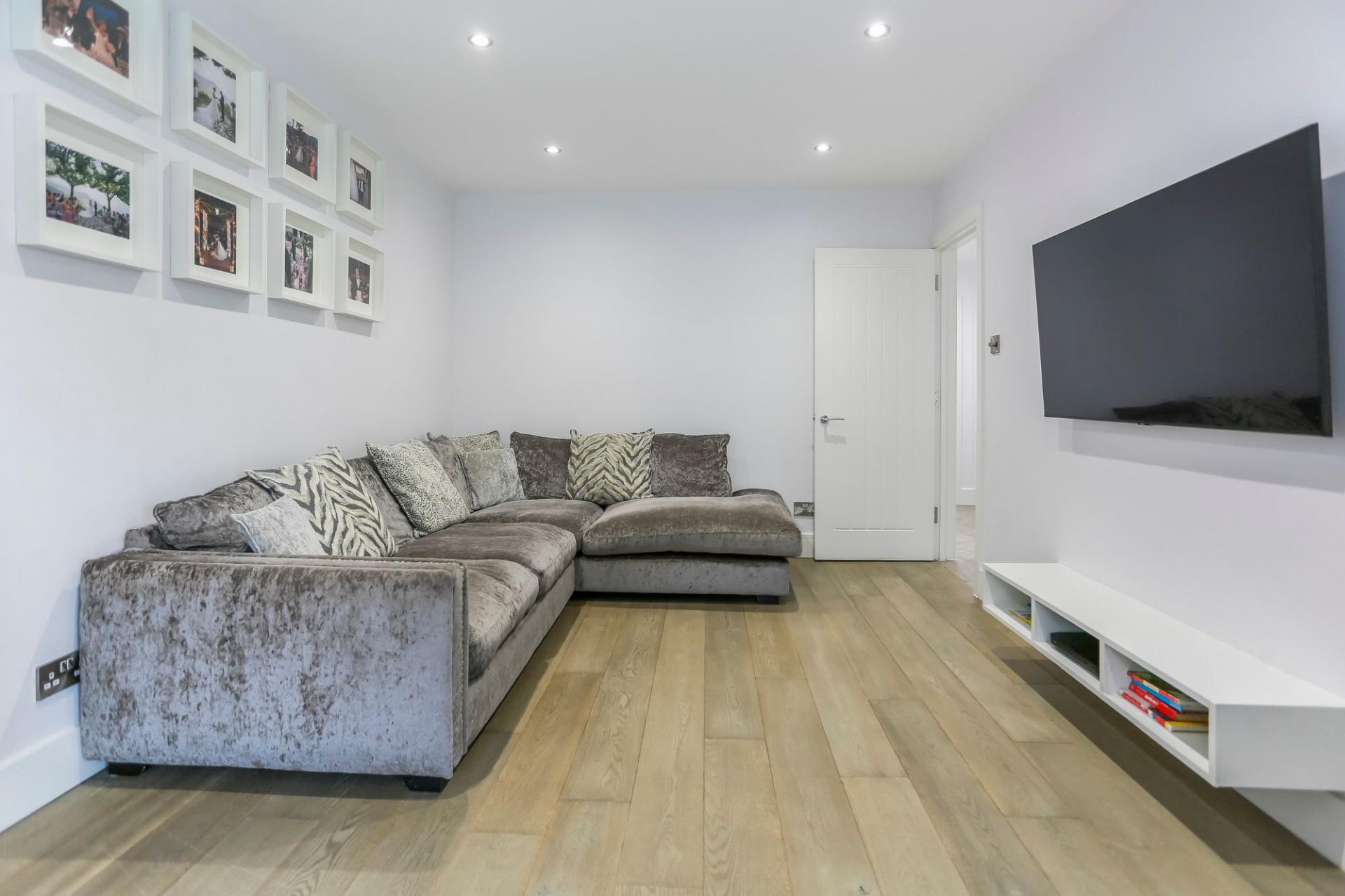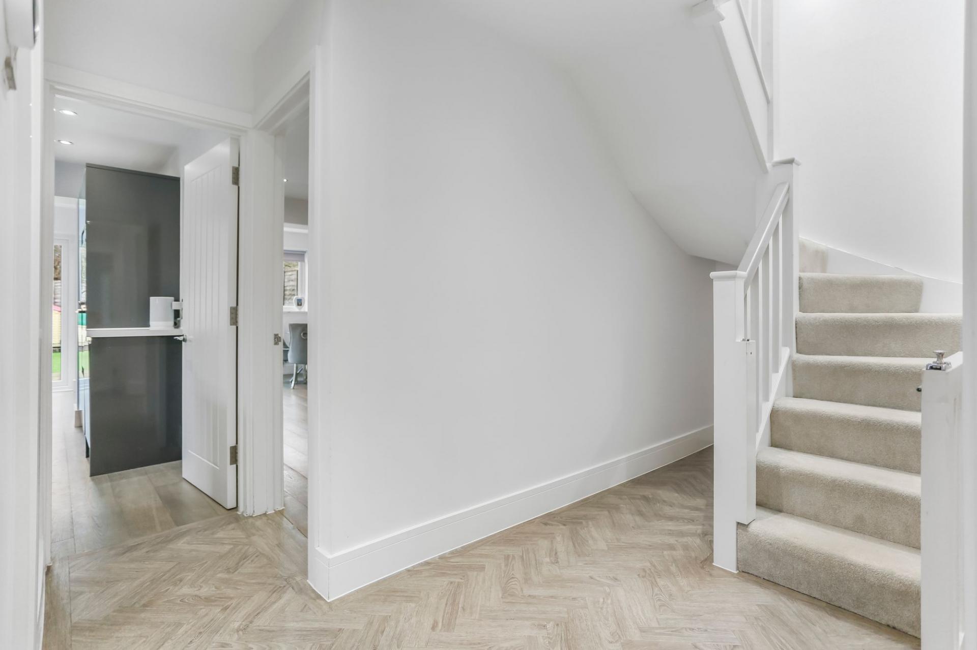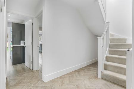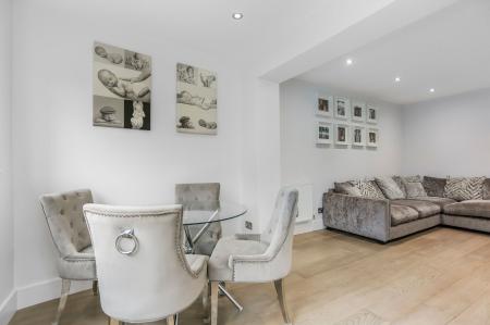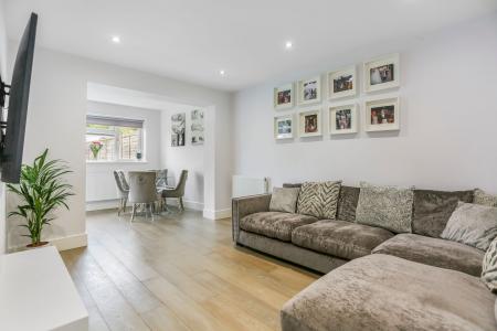 A light-filled hallway leads into the thoughtfully arranged ground floor living space, designed to create a natural flow between rooms while still maintaining a sense of privacy. The contemporary kitchen opens into the dining area, where large patio doors provide direct access to the rear patio and garden. The dining space flows seamlessly through to the living room, which can also be accessed from the hallway. Two double bedrooms and a well-appointed family bathroom complete the ground floor.