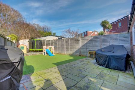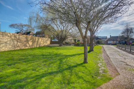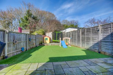 To the front, a long driveway provides off-road parking for multiple vehicles and is complemented by a large, well-maintained garden that creates an attractive and welcoming approach. The rear garden features a patio area ideal for outdoor dining, alongside a lawned section of artificial grass offering a low-maintenance and family-friendly space.