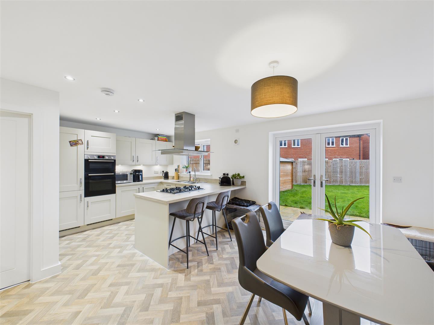 Dining Kitchen - A super room situated to the rear of the house with a window and double doors opening out to the patio. The kitchen features an array of fitted contemporary units with work surfaces, one and a half sink and drainer with mixer tap and integrated appliances include a double oven, five ring gas hob with ceiling mounted extractor hood above, dishwasher and fridge freezer.
