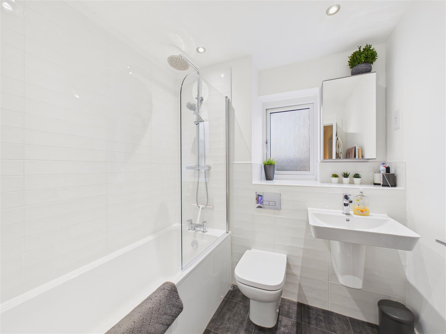 Bathroom - With stylish white suite comprising wash hand basin, concealed flush W.C., bath with both a handheld and rainhead shower above, glazed partition, tiled surround to walls, heated towel rail.