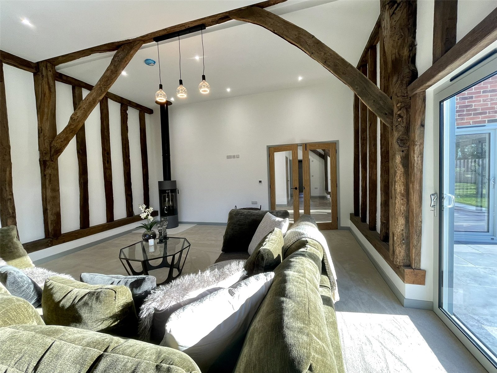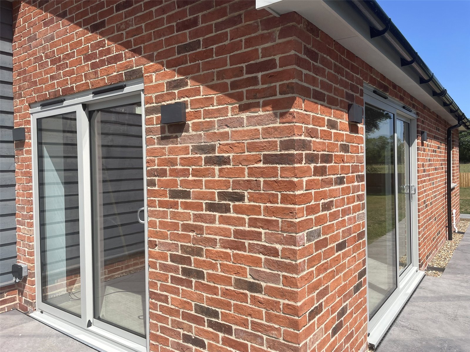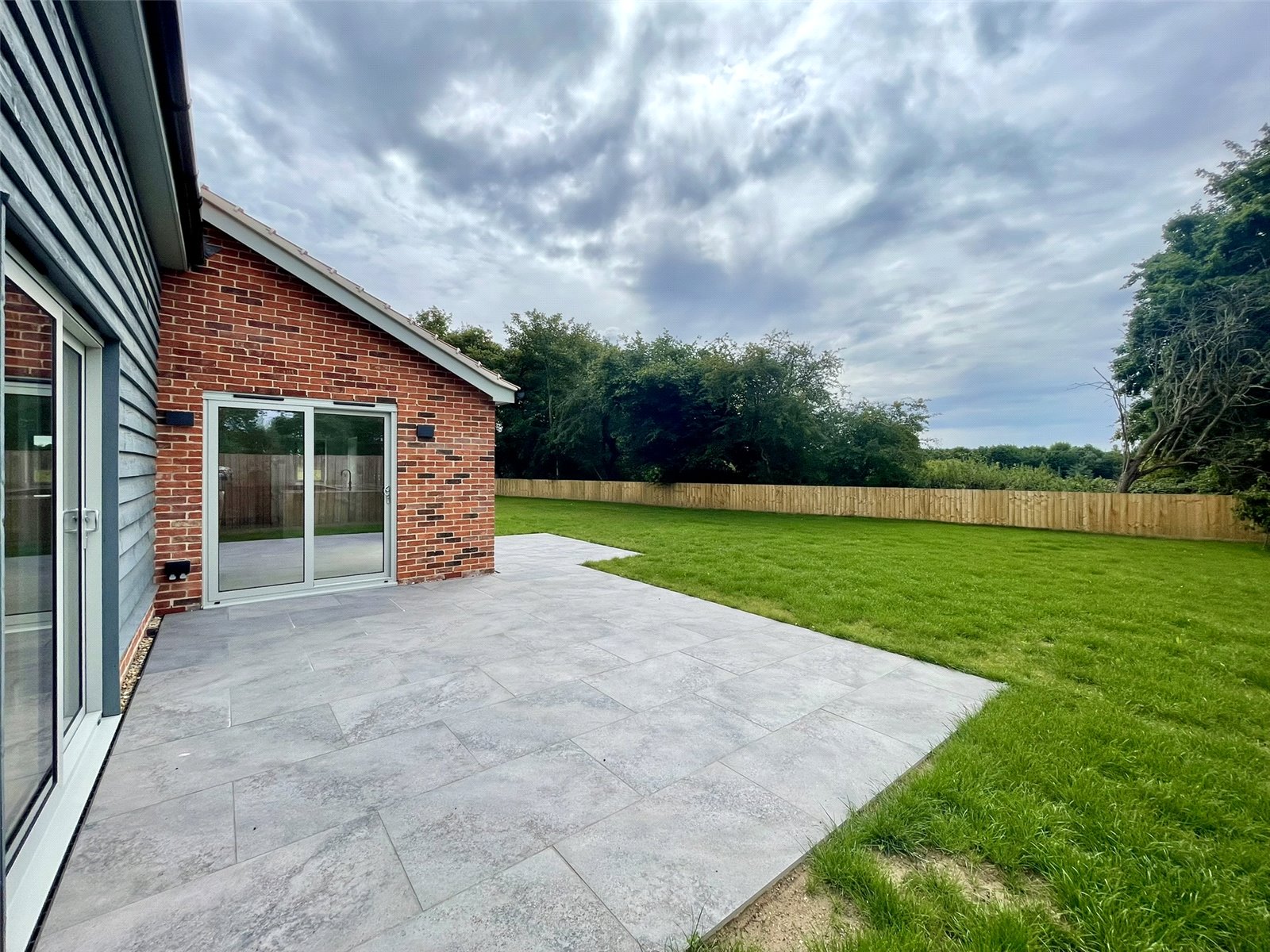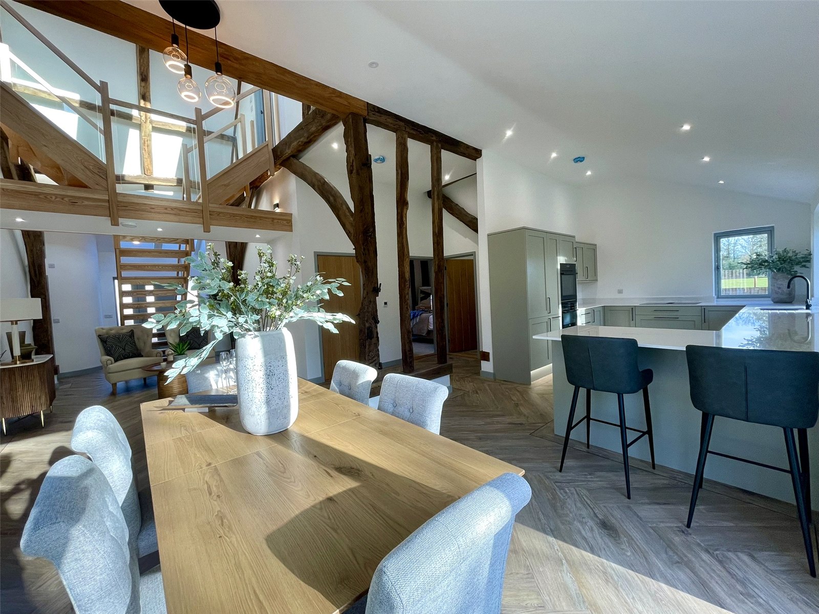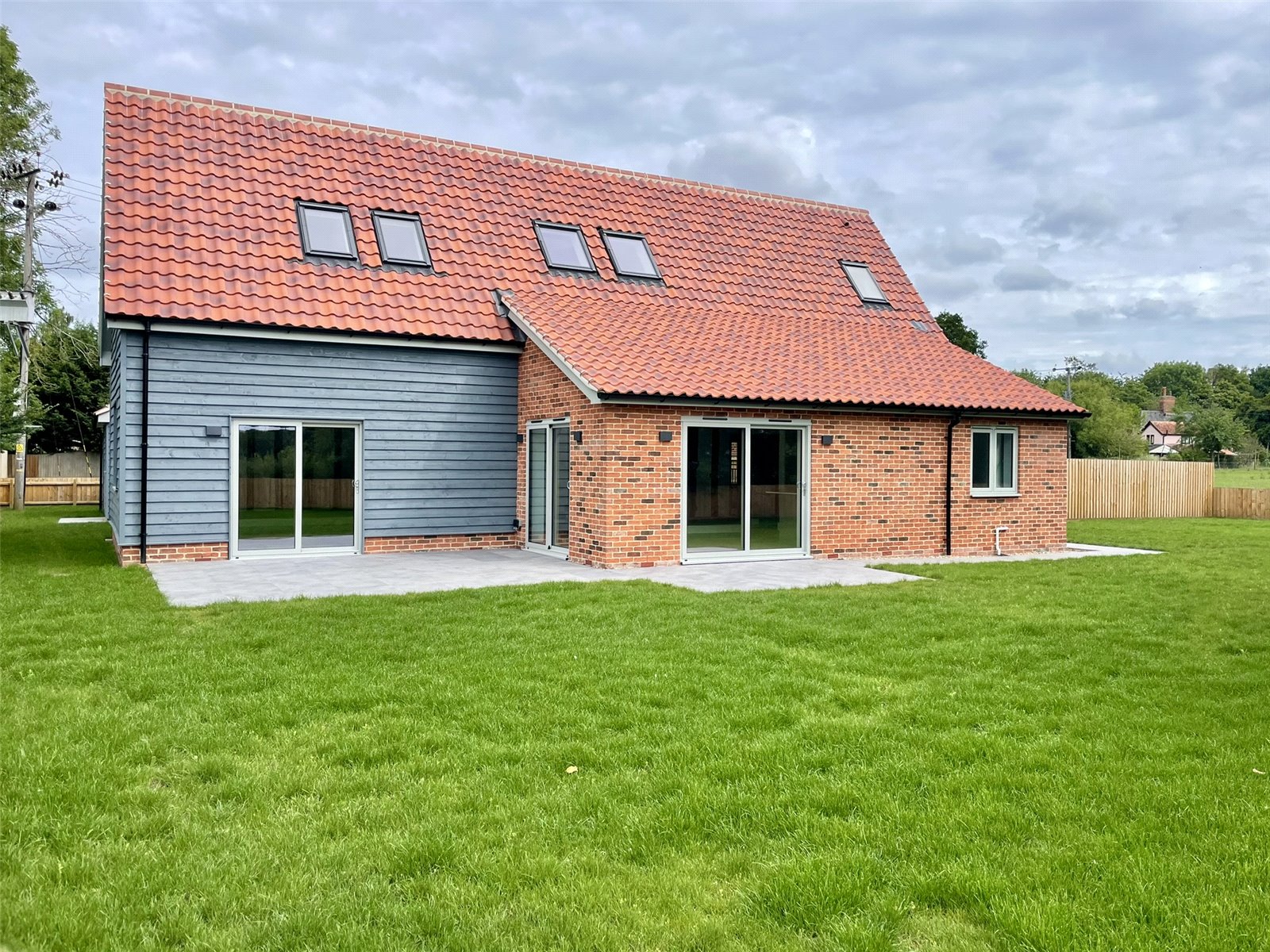 Constructed by a long established and respected local builder these individual properties are a rare opportunity to acquire small scale quality homes in a time of mass produced hurriedly built units. Time has been taken to complete each of the three different properties and this is clear from the quality of brickwork and internal finishes. Plot 2 has a remarkable story to tell and at first glance suggests it is a brand new property designed to appear as a timber frame barn type building. Whilst this is true to a point, it is not until stepping inside one sees the true character of what is in fact the reconstruction of an actual timber frame threshing barn with all the timber features one would expect. This particular building has Suffolk roots and was constructed originally in Walsham le Willows. Having been dismantled by the current owner and carefully stored for over thirty years, it was not until Covid struck that time was found to explore the possibility of re erecting the barn. Moved to Hoxne, the timber frame was painstakingly re erected and as one will see when visiting, the interior offers everything one would hope for in a classic timber barn conversion. This really is the best of both worlds having as it does all the benefits of a new home along with the timbered character, space and volume of a barn. The cathedral like entrance, now featuring a bespoke Ash staircase leads you in to flexible multi room space which includes ground and first floor bedroom options including four bath/shower rooms and light, airy and voluminous day space. Underfloor heating extends through the ground floor with radiators upstairs all powered from a tailor made Samsung air source heat pump. Thoughtful installation of sockets, switches and lighting adds to the day to day convenience. The design of the house has incorporated clever sight lines with glazed openings visible throughout the interior. The well appointed kitchen includes AEG appliances including induction hob with integrated down draught extraction, full size dishwasher and 72L & 40L ovens including microwave function. Likewise, bath and shower rooms include stylish fittings, washstand storage and touch sensor mirrors. Outside, similar attention to detail and time now shows us grass seeded lawn within close boarded fencing to the rear along with pathways and patios created from porcelain tiled surfaces. A detached double garage with additional parking space sits to one side.