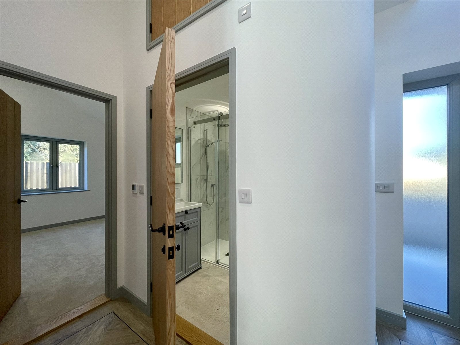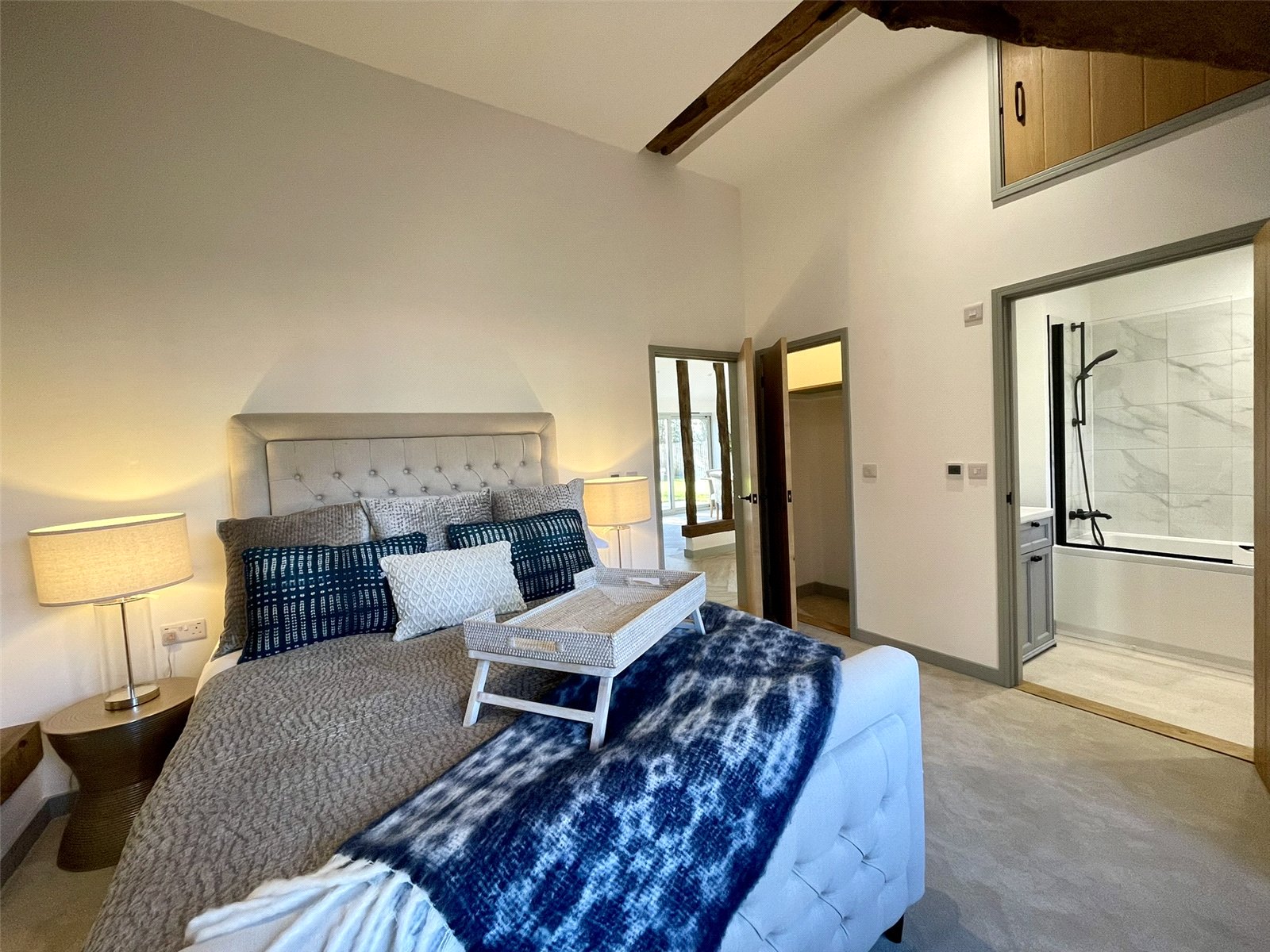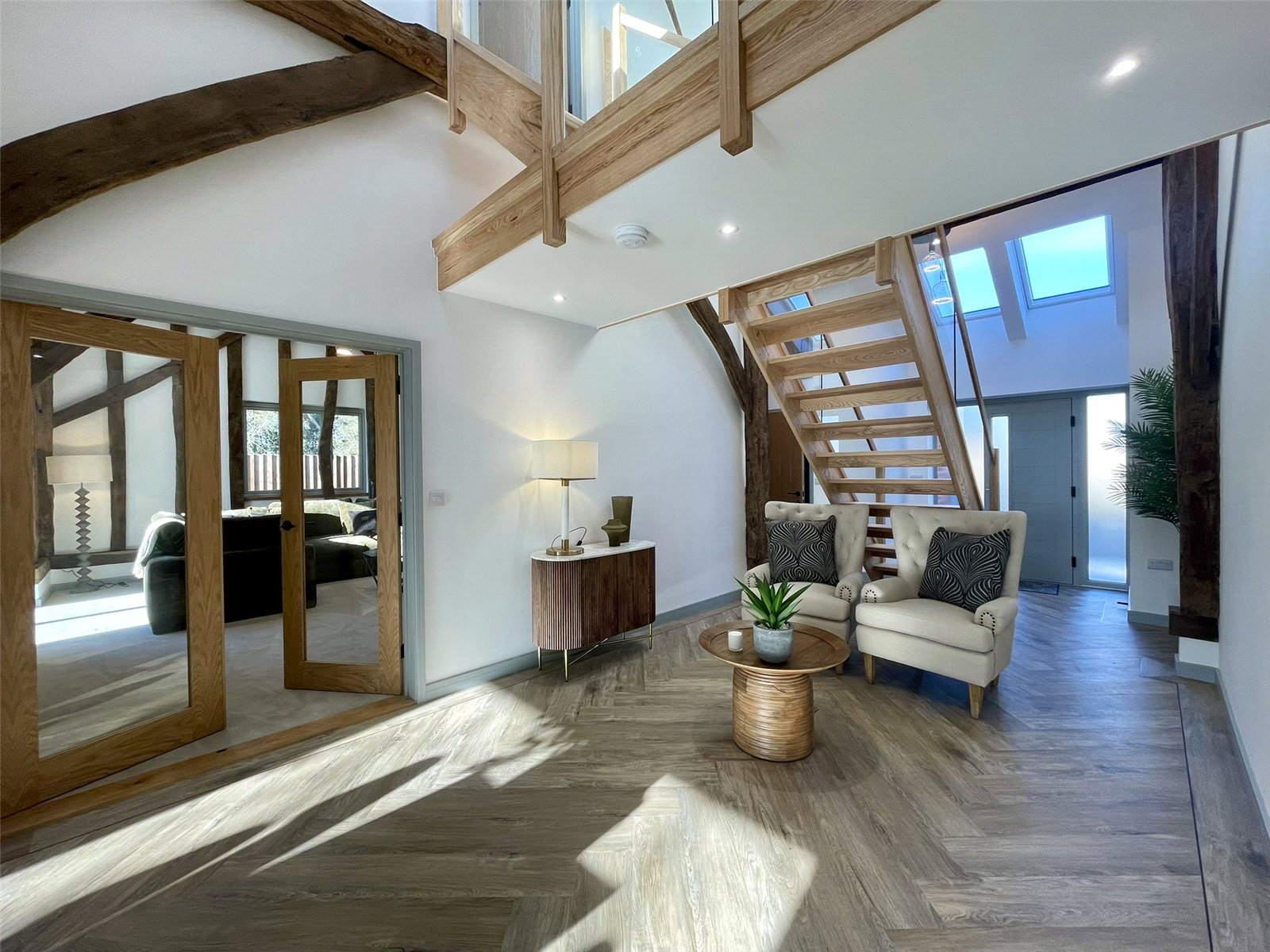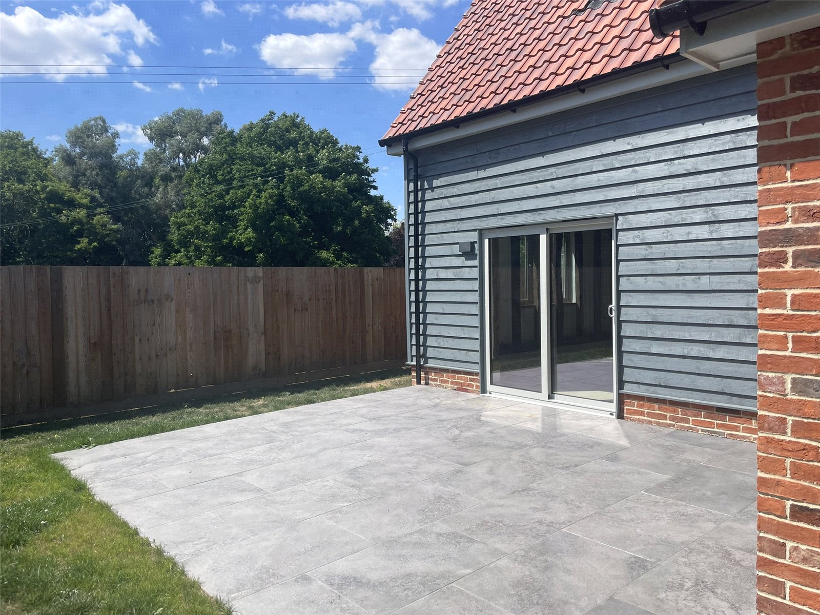 Constructed by a long established and respected local builder these individual properties are a rare opportunity to acquire small scale quality homes in a time of mass produced hurriedly built units. Time has been taken to complete each of the three different properties and this is clear from the quality of brickwork and internal finishes. Plot 2 has a remarkable story to tell and at first glance suggests it is a brand new property designed to appear as a timber frame barn type building. Whilst this is true to a point, it is not until stepping inside one sees the true character of what is in fact the reconstruction of an actual timber frame threshing barn with all the timber features one would expect. This particular building has Suffolk roots and was constructed originally in Walsham le Willows. Having been dismantled by the current owner and carefully stored for over thirty years, it was not until Covid struck that time was found to explore the possibility of re erecting the barn. Moved to Hoxne, the timber frame was painstakingly re erected and as one will see when visiting, the interior offers everything one would hope for in a classic timber barn conversion. This really is the best of both worlds having as it does all the benefits of a new home along with the timbered character, space and volume of a barn. The cathedral like entrance, now featuring a bespoke Ash staircase leads you in to flexible multi room space which includes ground and first floor bedroom options including four bath/shower rooms and light, airy and voluminous day space. Underfloor heating extends through the ground floor with radiators upstairs all powered from a tailor made Samsung air source heat pump. Thoughtful installation of sockets, switches and lighting adds to the day to day convenience. The design of the house has incorporated clever sight lines with glazed openings visible throughout the interior. The well appointed kitchen includes AEG appliances including induction hob with integrated down draught extraction, full size dishwasher and 72L & 40L ovens including microwave function. Likewise, bath and shower rooms include stylish fittings, washstand storage and touch sensor mirrors. Outside, similar attention to detail and time now shows us grass seeded lawn within close boarded fencing to the rear along with pathways and patios created from porcelain tiled surfaces. A detached double garage with additional parking space sits to one side.