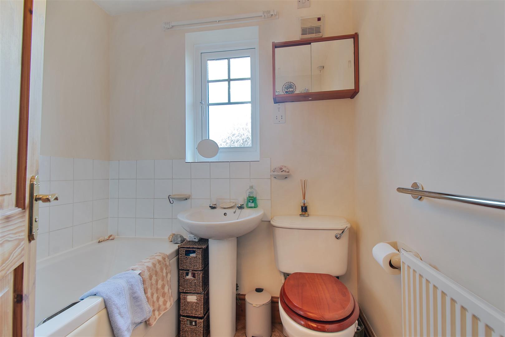 BATHROOM comprising a white suite; panel bath with shower over, pedestal wash hand basin with tiled splash back, low suite WC, frosted uPVC double glazed window.