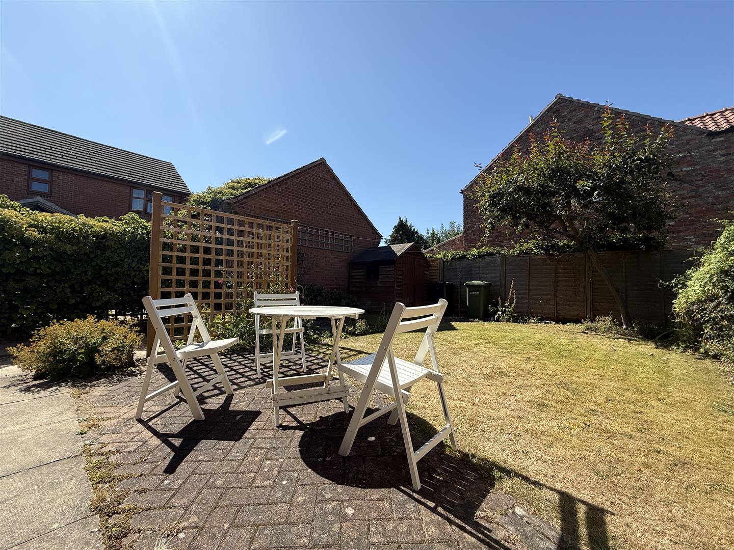 OUTSIDE at the front is mainly laid to lawn behind a neatly clipped hedge forming the front boundary and providing a degree of privacy. A path leads to the entrance door. To the side a five bar timber gate opens onto a driveway with a pathway to the side leading to the rear door. Adjoining the path is a brick sett patio with a laid to lawn south facing garden which is part walled and fenced. with maturing borders and useful timber storage shed and hard standing bin storage area.