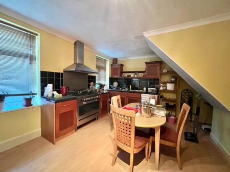 The kitchen is fitted with a range of wood-effect wall and base units, complemented by roll-edge countertops. It includes a stainless steel sink with a mixer tap, a six-ring gas cooker with an oven and extractor, and space for a freestanding fridge-freezer. Ample cupboard space and two rear-facing double-glazed windows overlooking the garden make this a functional and inviting area.