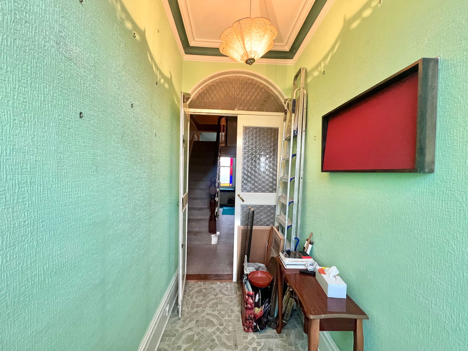 The property welcomes you through a uPVC entrance door into a practical entrance porch. Beyond the porch, a grand wooden door leads into an impressive entrance hall with high ceilings, a striking central staircase, and a central heating radiator. The hall provides access to the lounge and dining room, setting the tone for the home’s spacious layout.