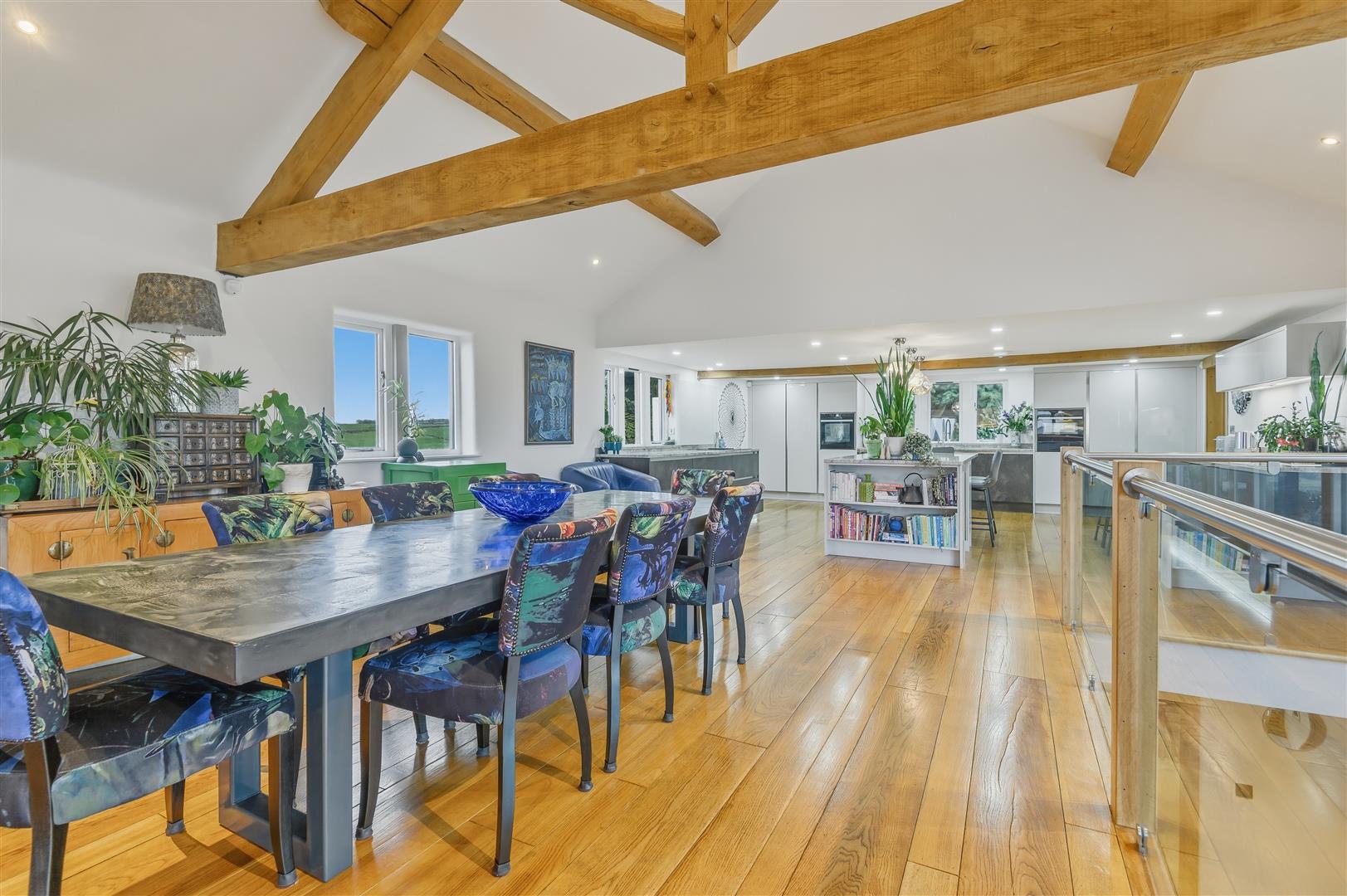 Positioned beneath a dramatic exposed truss with timber beams, the dining area creates a memorable setting for entertaining, with open views across the surrounding landscape.