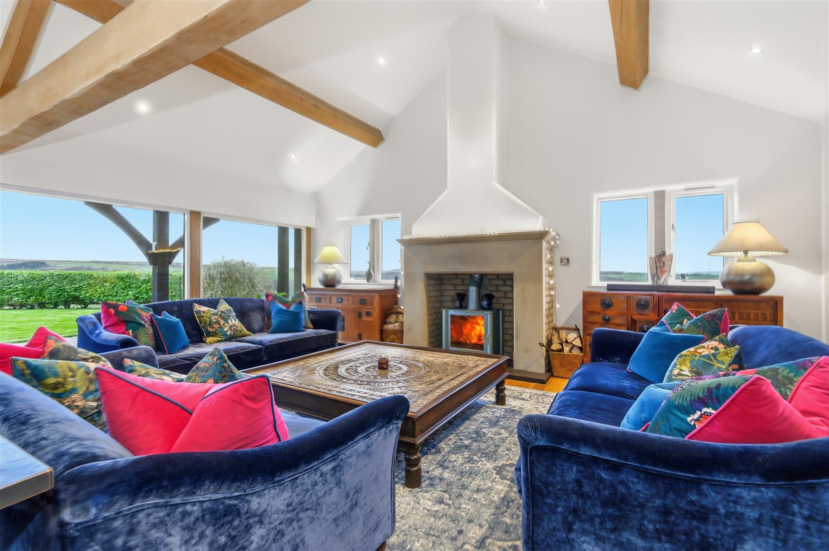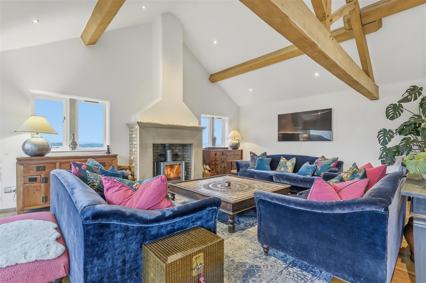 Underfloor heating runs throughout the ground floor, while wooden floorboards and exposed timber beams add warmth and character. Windows to all four sides flood the room with natural light and frame breathtaking views across the moors.