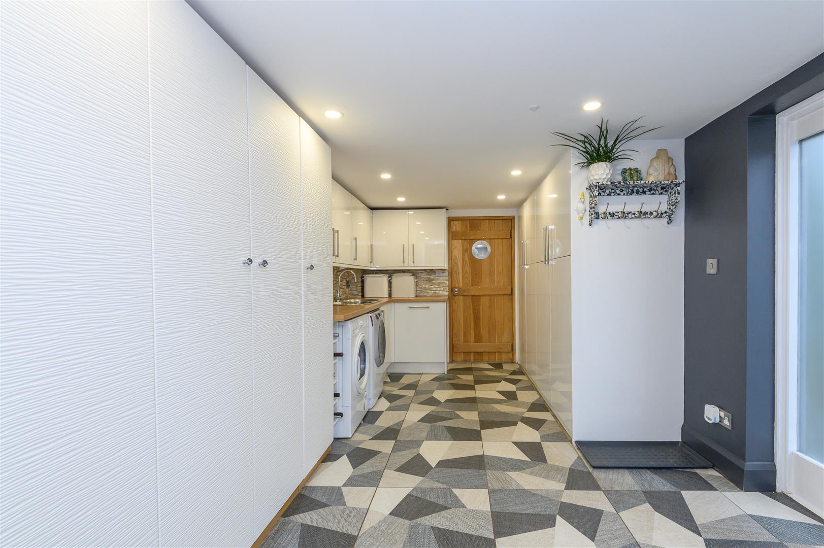 The spacious entrance doubles as a practical utility space, complete with fitted shoe storage, wardrobes, and hanging space for coats. Wall and base cabinets provide further storage, alongside a sink and plumbing for laundry appliances. The air-source heat pump and airing cupboard are also located here.
