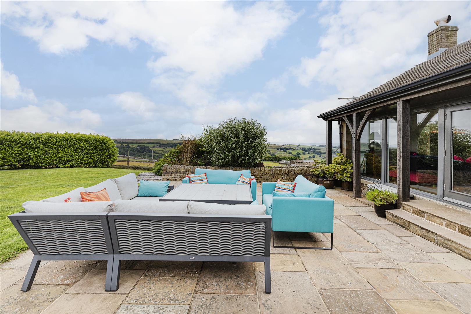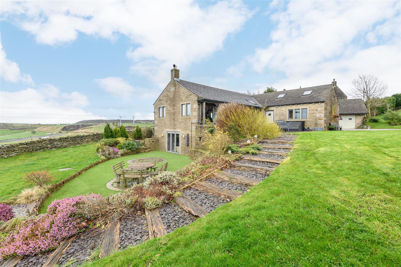 Bifold doors open directly onto the sunken garden, allowing you to step outside and enjoy panoramic views across the landscape.
