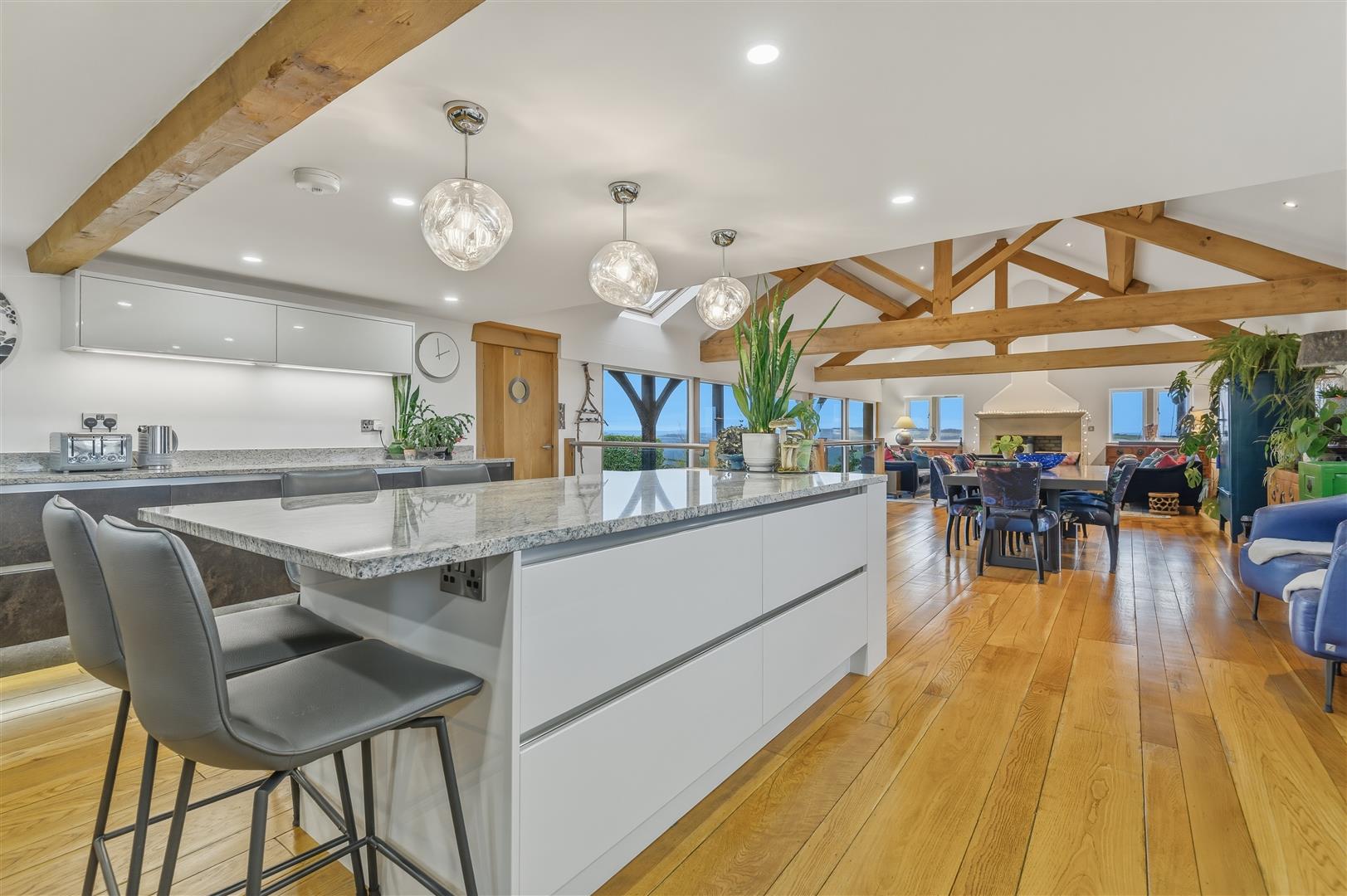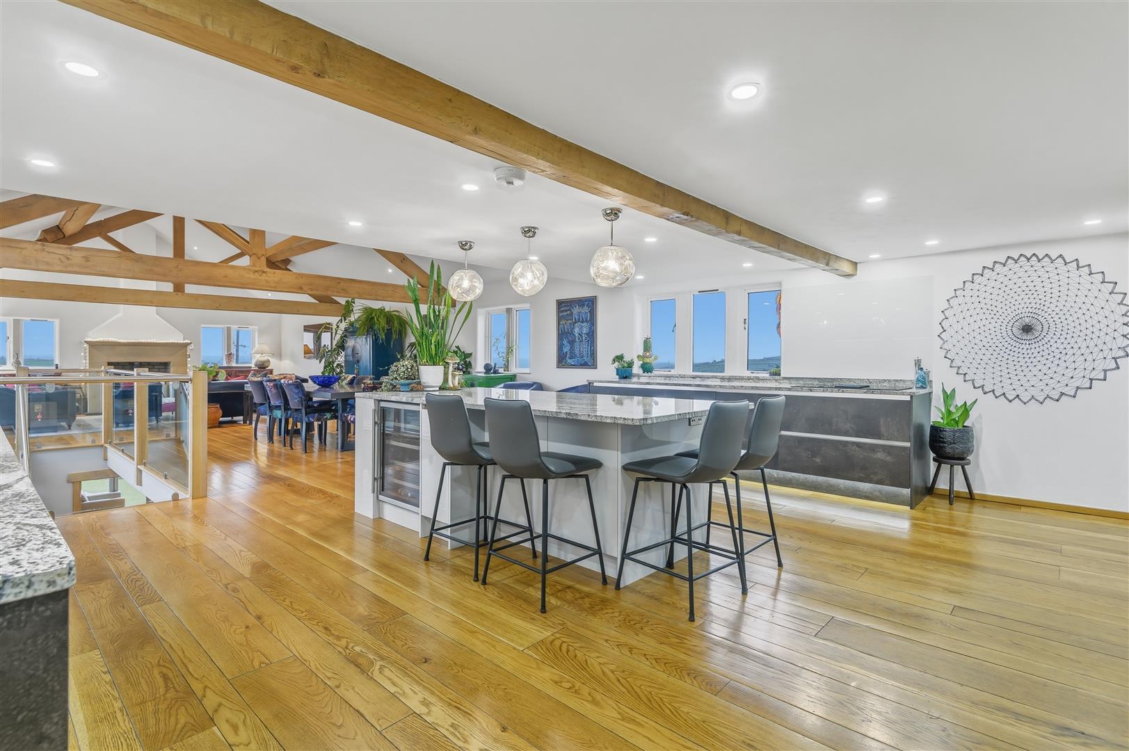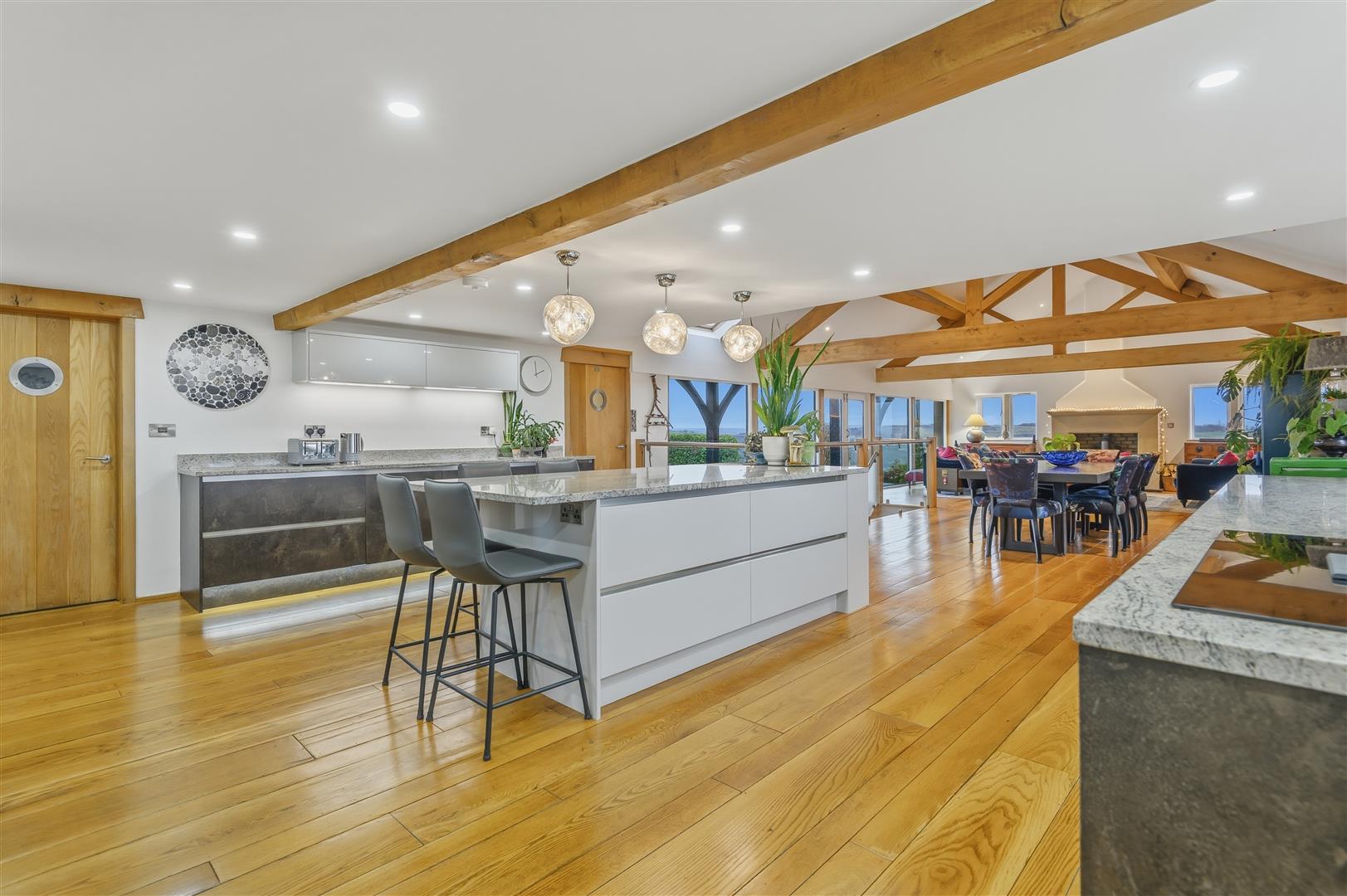 • Striking open-plan living kitchen diner with windows to all four sides