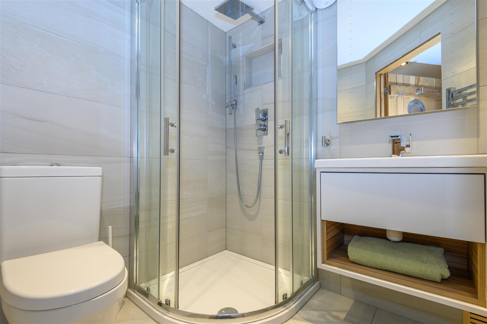 The family bathroom offers a luxurious, spa-like feel, complete with sauna, jet bath, and walk-in rainfall shower with floating bench. Additional bathrooms throughout the home ensure both practicality and comfort for family living and guests.
