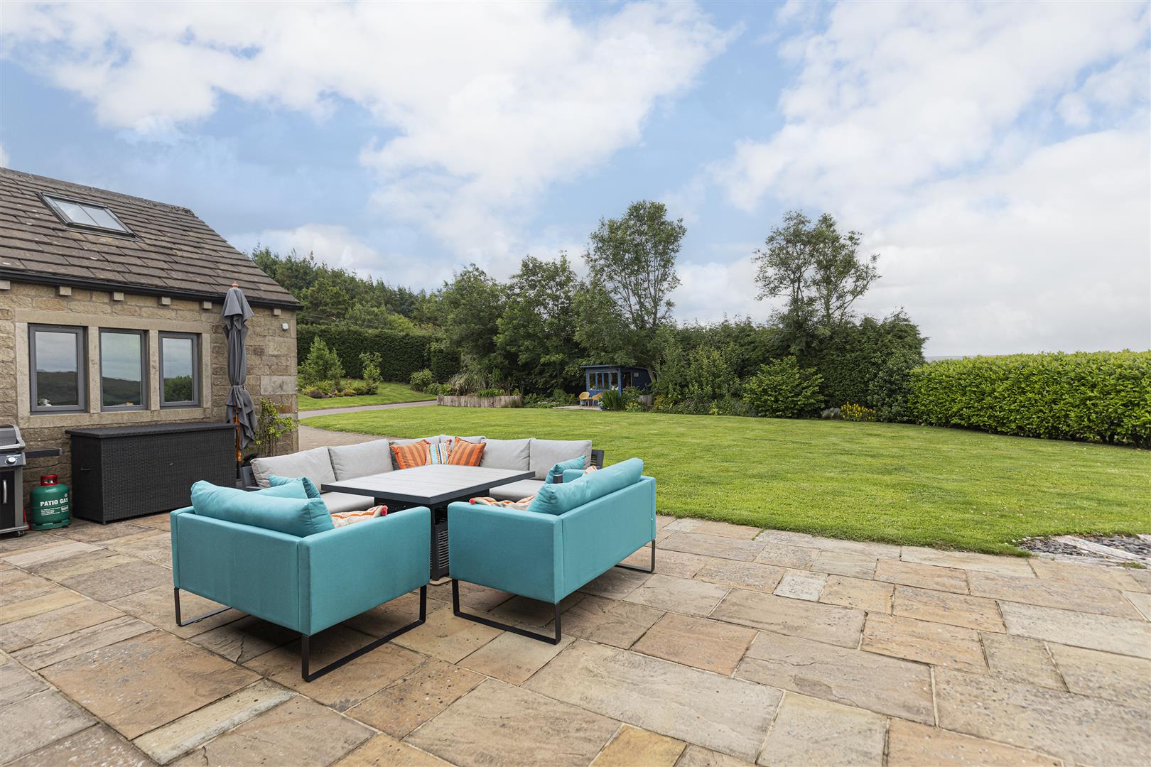 The lounge area offers a warm and inviting retreat centred around a multi-fuel stove from Firebelly in Elland, set within an impressive stone surround. French doors open directly onto the patio, creating a seamless transition between indoor living and the outdoor entertaining areas.