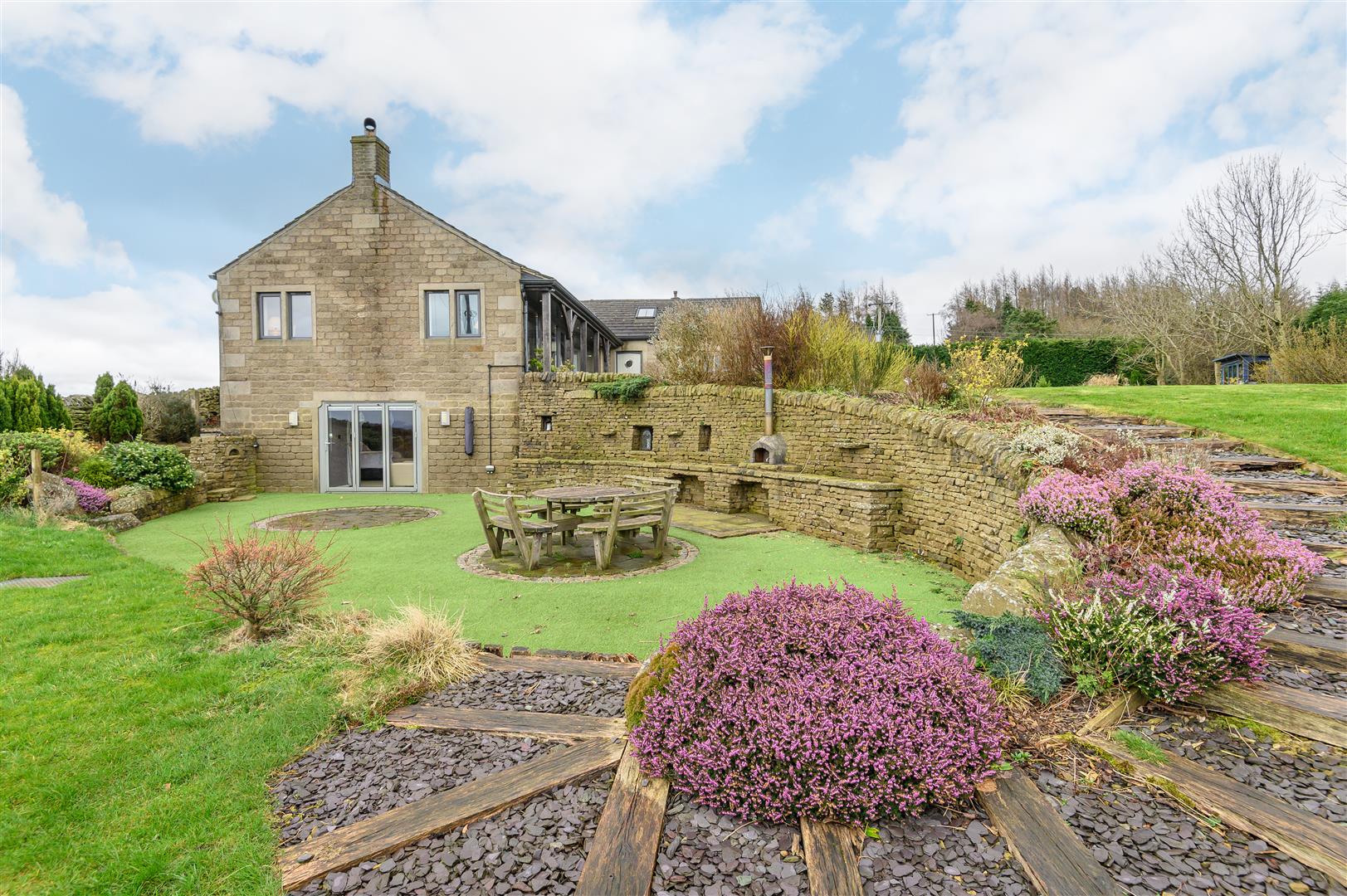 One of the most distinctive features is the sunken garden, designed as a sheltered outdoor entertaining space with circular patio areas and a built-in brick pizza oven - ideal for gathering with friends and family on long summer evenings.