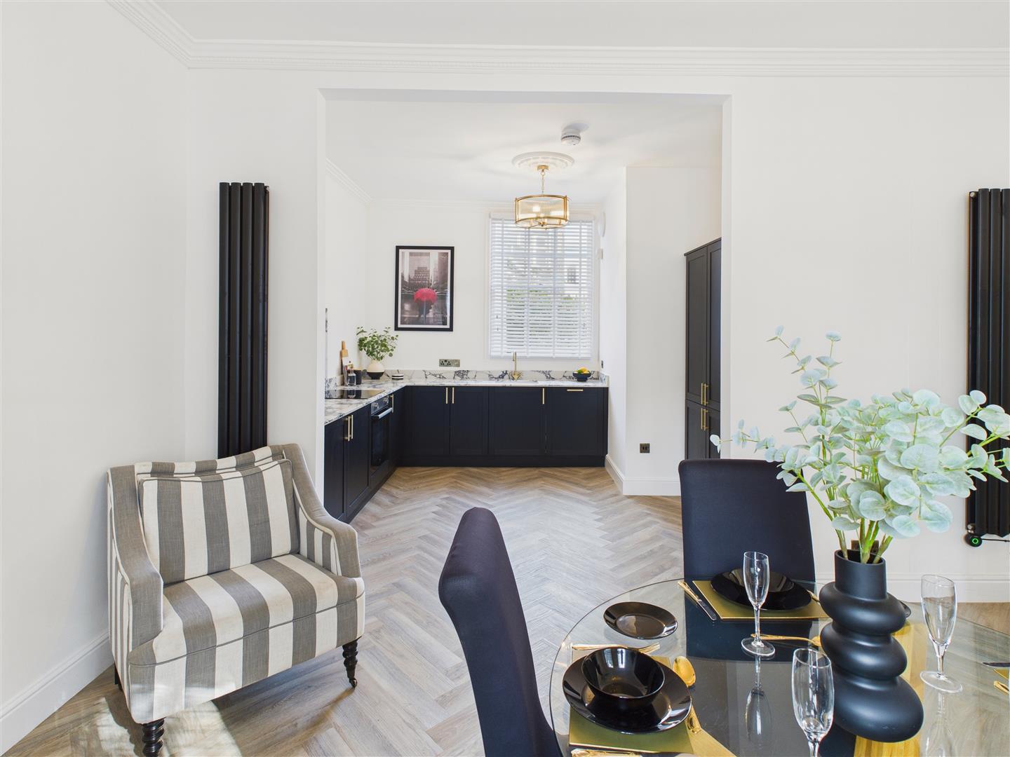 Dining/Living Area - A beautiful room with elegant high ceilings, detailed cornicing and ceiling rose. Two sash windows to the front elevation, designer radiators. This room is open plan in style through to the kitchen.