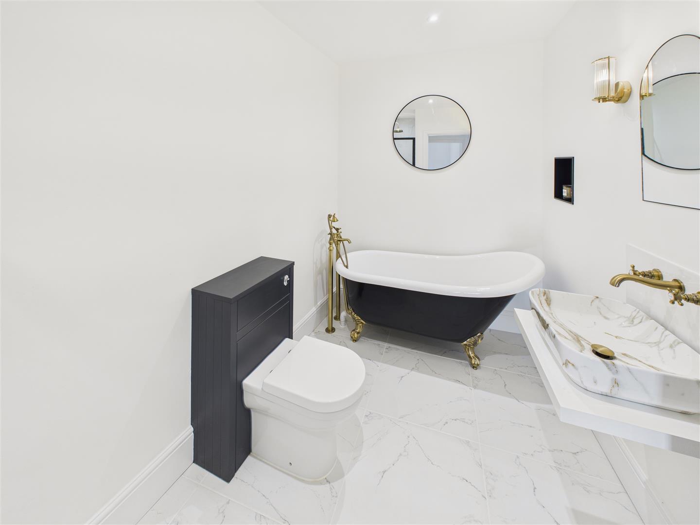 Bathroom - A newly installed striking bathroom suite featuring a stunning slipper style claw footed bath with antique style mixer tap. Designer porcelain wash hand basin on plinth, with antique style bath from the wall, concealed flush WC, shower cubicle with both handheld and rain head shower system, complete with tiled surround. Heated towel rail, tiling to the floor.