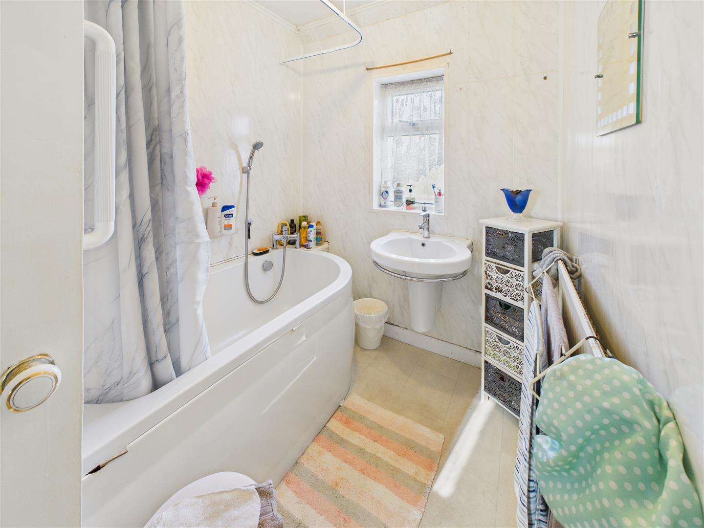 Bathroom - Comprising a bath with shower fitting to the corner and wash-hand basin beneath window to the front elevation.
