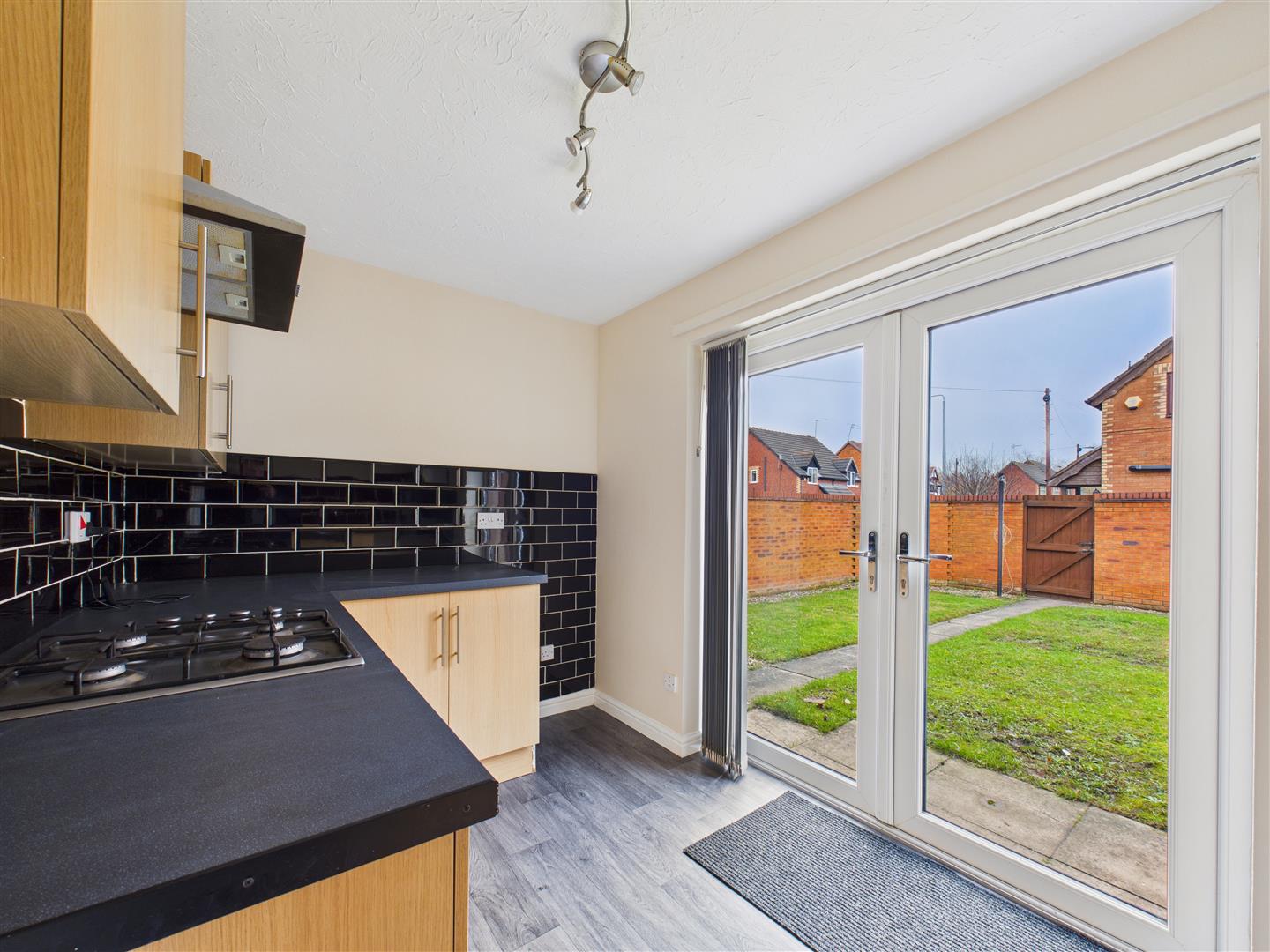Kitchen - Comprising fitted units and worksurfaces with tiled splashbacks, four-ring gas hob with filter unit above, sink & drainer, integrated oven and French doors to the rear garden.