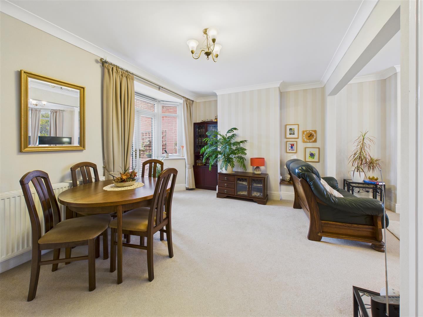 Lounge/Dining Room - Spacious main reception area comprising a lounge and dining area. The dining area has a window to the side and French doors to the rear patio, with an opening leading through to the lounge, which presents an electric fireplace and large bay window to the front.