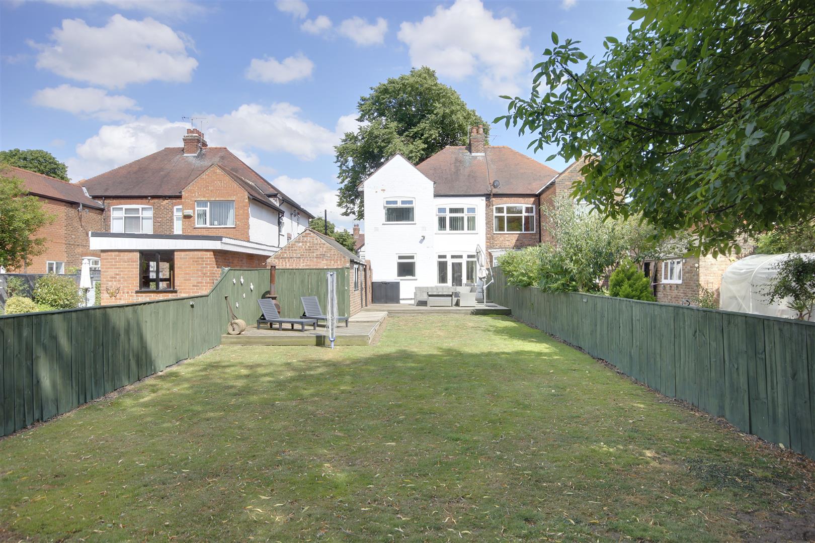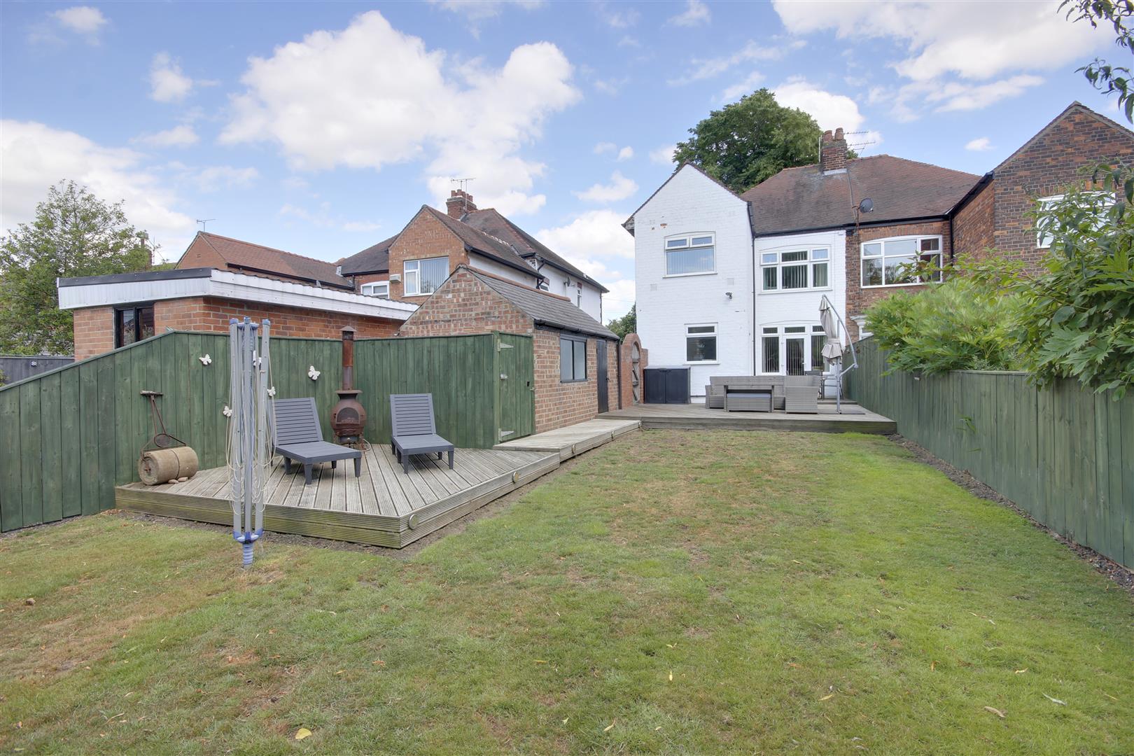 Outside - Outside, a gravelled drive fronts the property, while a block-paved drive to the side leads to a detached garage. The large rear garden enjoys a desirable south-westerly aspect, boasting an expansive decked patio area and an extensive lawn beyond.
