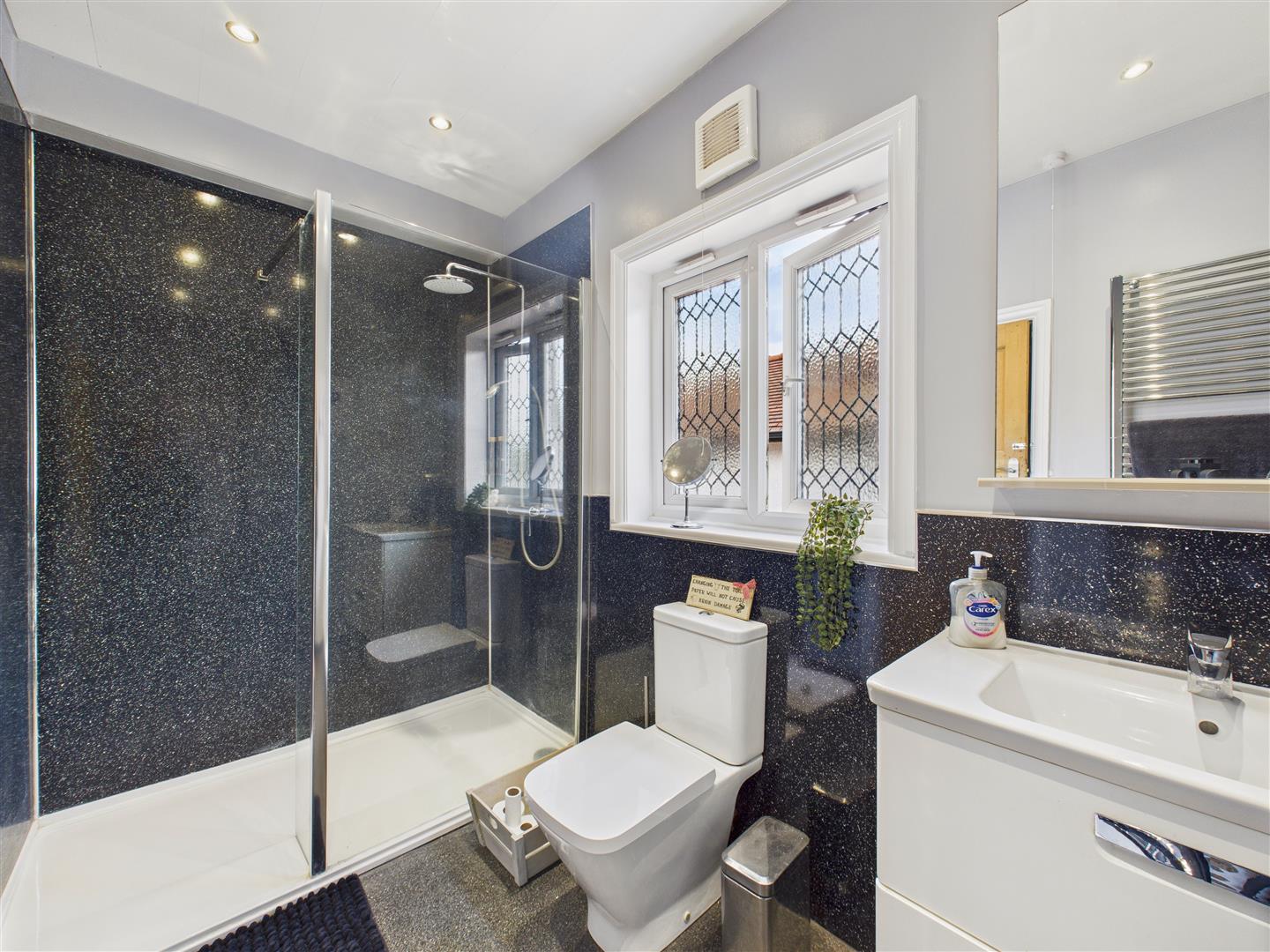Shower Room - With modern suite comprising a walk in shower, vanity unit with wash hand basin and low flush W.C. Part panelling to walls and window to side.