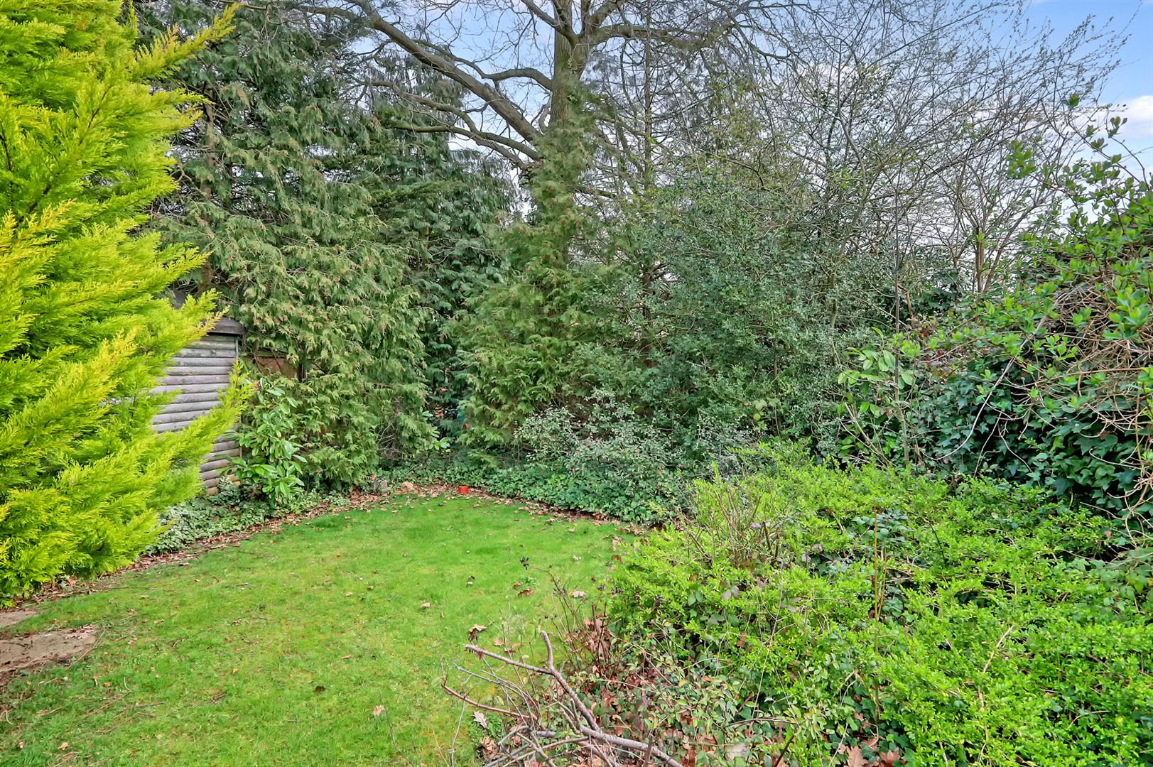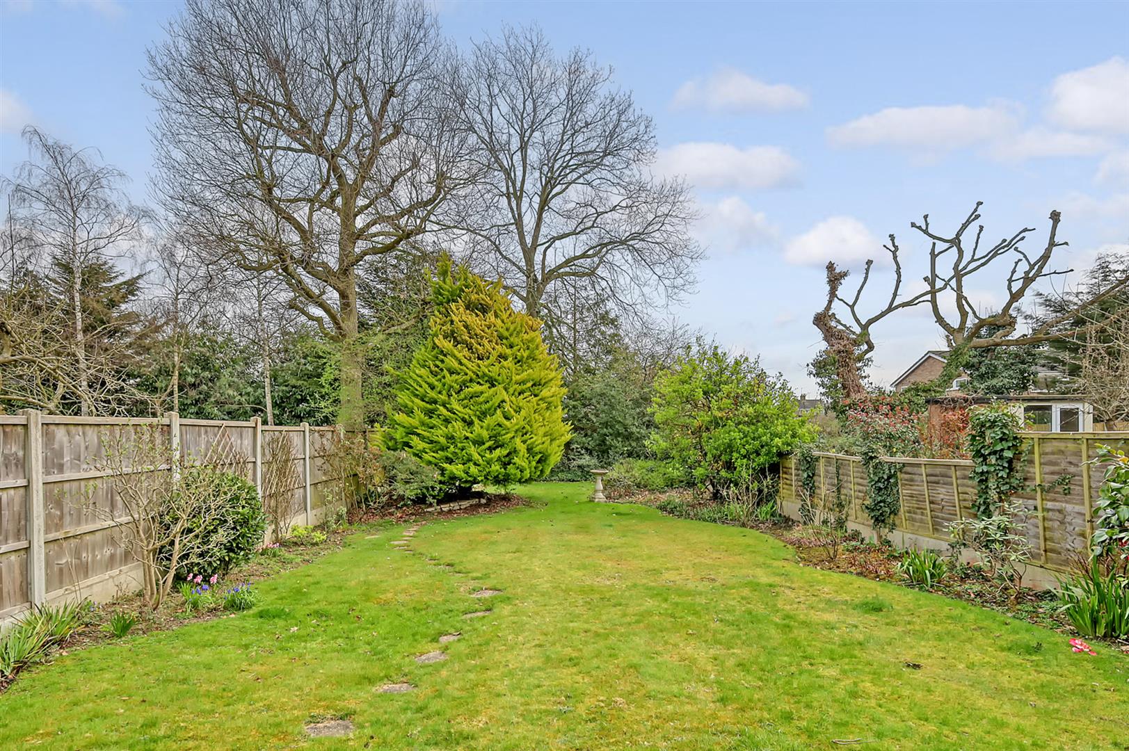 Externally, the home is approached via a paved driveway, with a garage to the side providing extra storage or vehicle space. The rear garden features a patio area, with the remainder laid to lawn, surrounded by mature trees and shrubs.