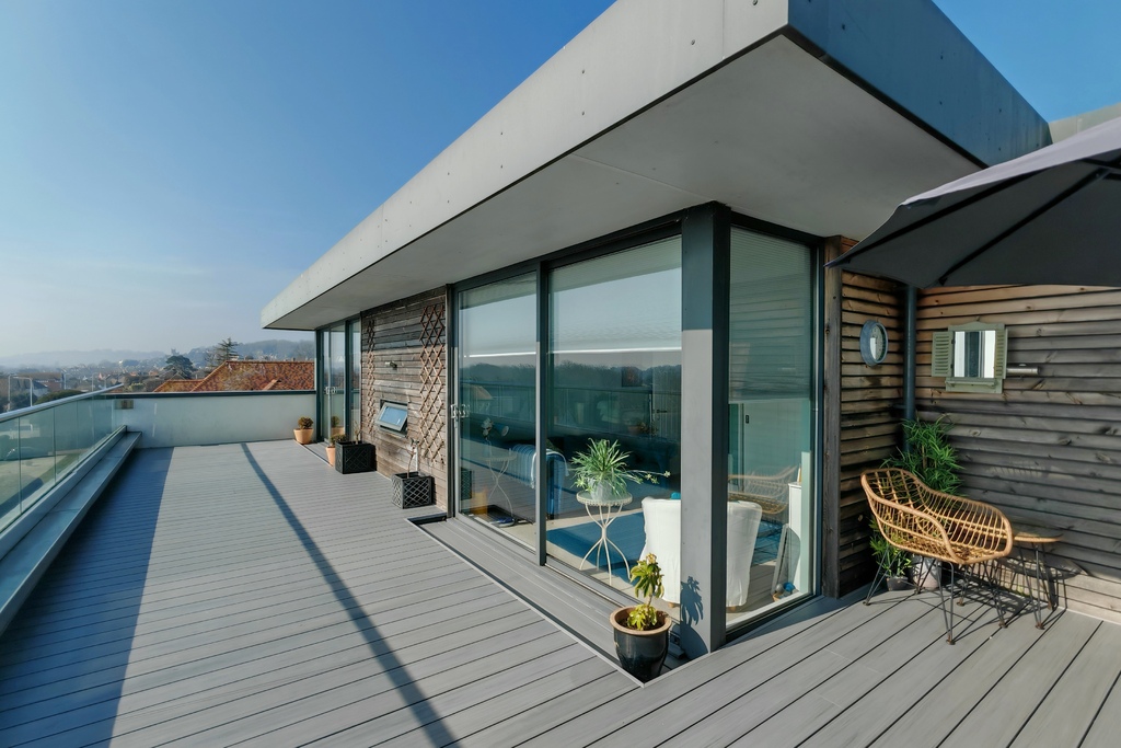 with ample outside dining/seating areas, raised glass balustrades making the most of the panoramic views and brushed stainless steel handrails over, newly installed composite decking, access via sliding doors to two bedrooms and living room, clothes drying area to side, outside wall lights and power points, cedar wood panelling to walls
