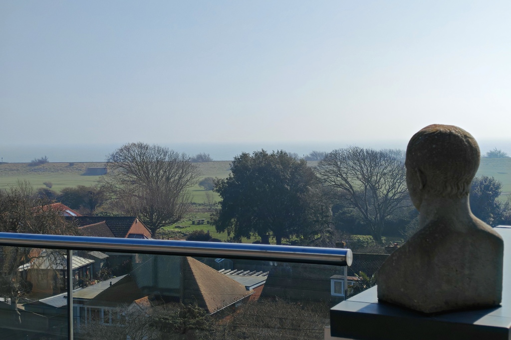 with full length rear aspect double glazed window, front aspect double glazed sliding doors accessing balcony and further full length front and side aspect double glazed windows taking full advantage of the open views across the golf course to the sea beyond (these windows and doors having fitted remote controlled heat and light activated blinds), 'Contura' contemporary style log burner, bespoke contemporary storage unit to one wall supplied and fitted by 'Thoroughly Wood' of Lyminge, glass door to-