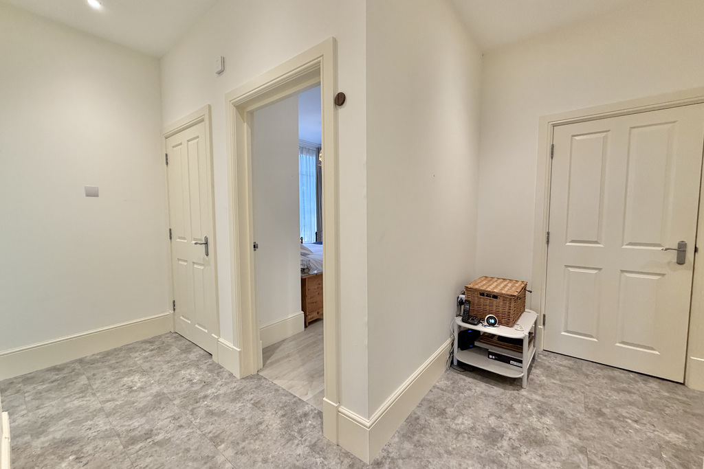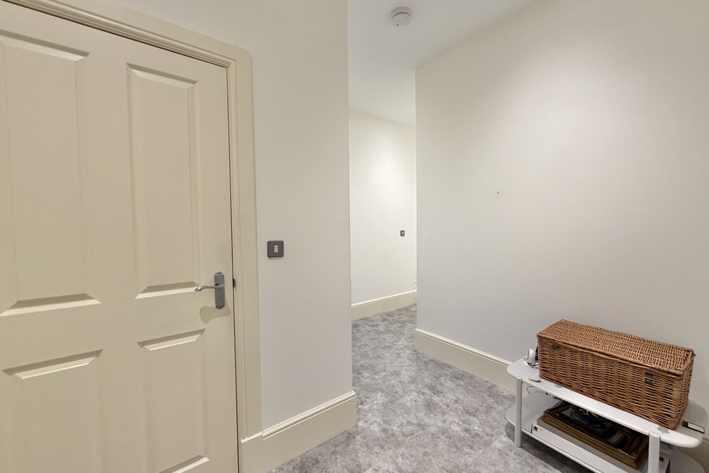 with door to communal area, tile effect LVT flooring, radiator, RCD fuse box, door leading into hall