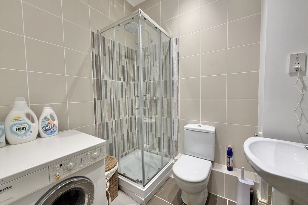with tile effect flooring, localised tiling, WC, hand basin with mixer tap over, shower cubicle with rainfall shower and separate hand attachment, space and plumbing for washing machine towel radiator