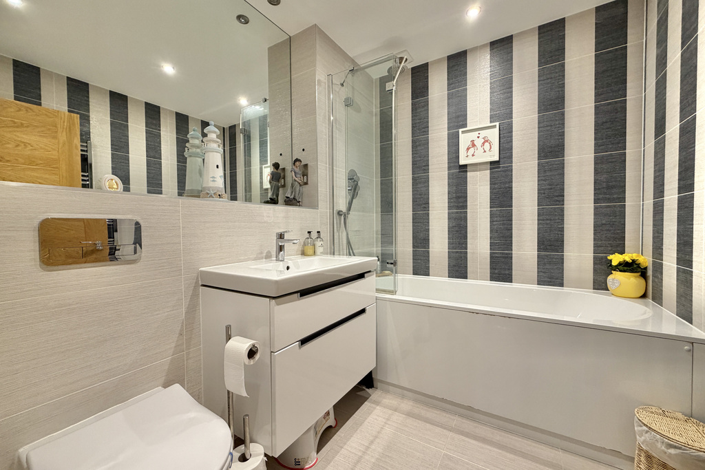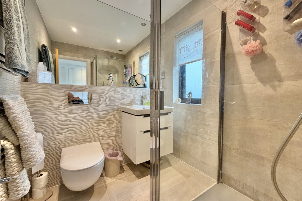 with modern tiling floor to ceiling, wall hung WC with concealed cistern, hand basin with mixer tap over and modern storage cabinet under, frosted double glazed window, towel radiator, shower cubicle with digital remote controlled rainfall shower over and separate hand attachment, large fitted mirror