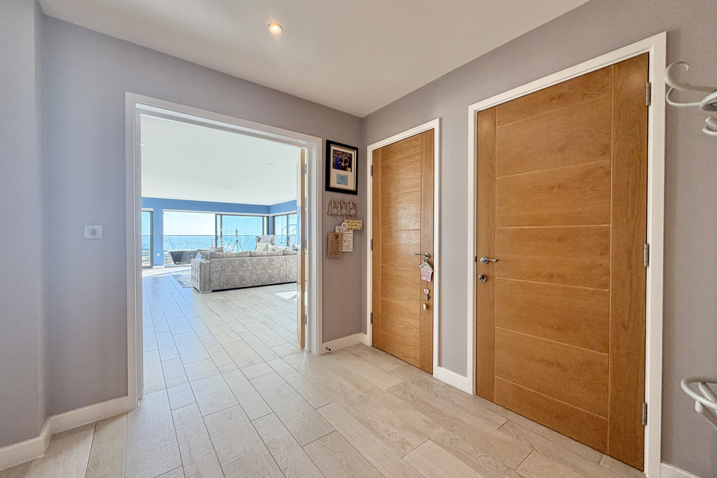 with wood effect tiled area, double glazed windows overlooking front with stunning sea views