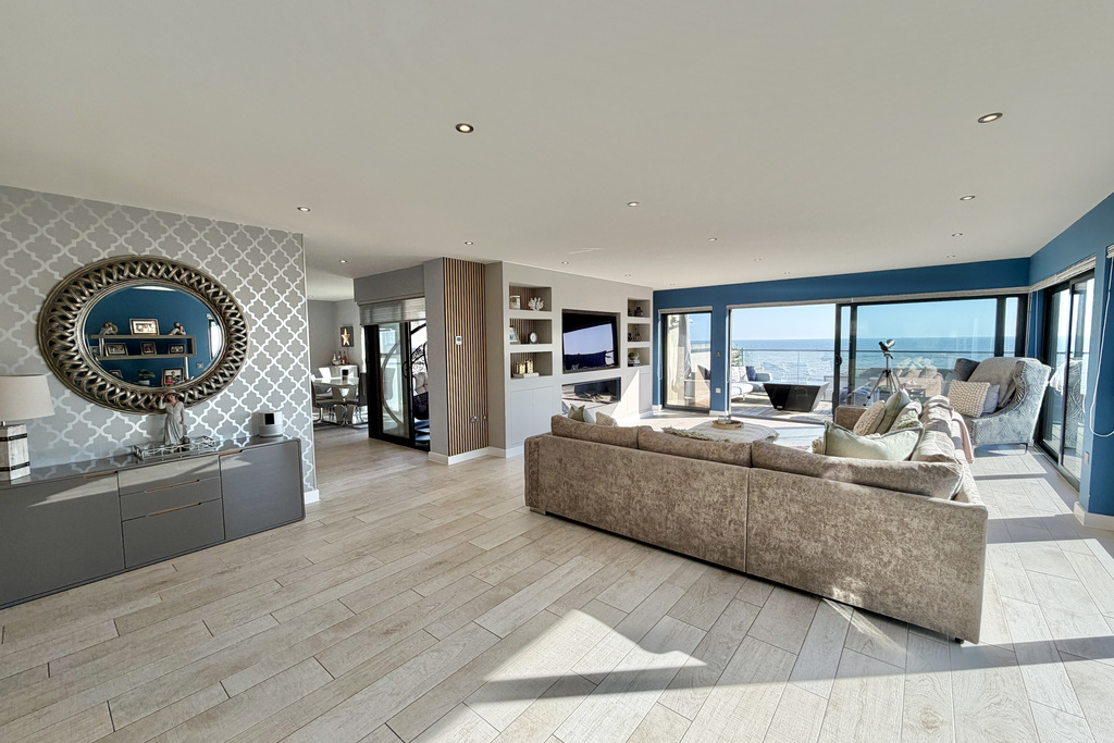 with wood effect tiled flooring, double glazed window to side, three double glazed sliding doors giving access out onto large spacious terrace taking full advantage of stunning sea views, media wall with built in storage cupboards, shelving, electric fireplace, opening into:
