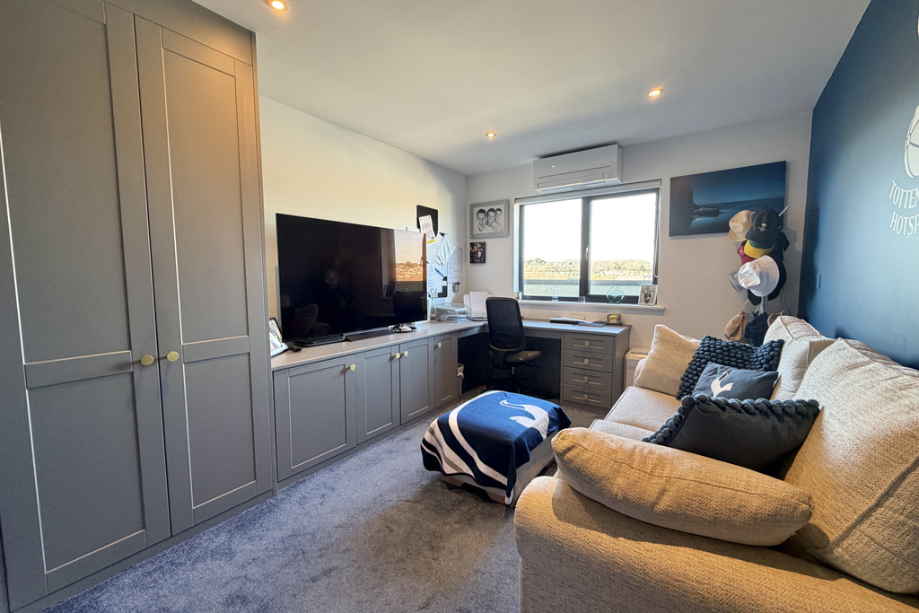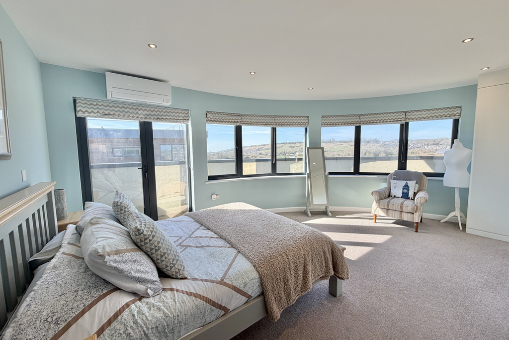 with double glazed feature curved windows overlooking roughs, built in wardrobes with shelving and hanging rails, air conditioning unit, double glazed doors leading out to terrace
