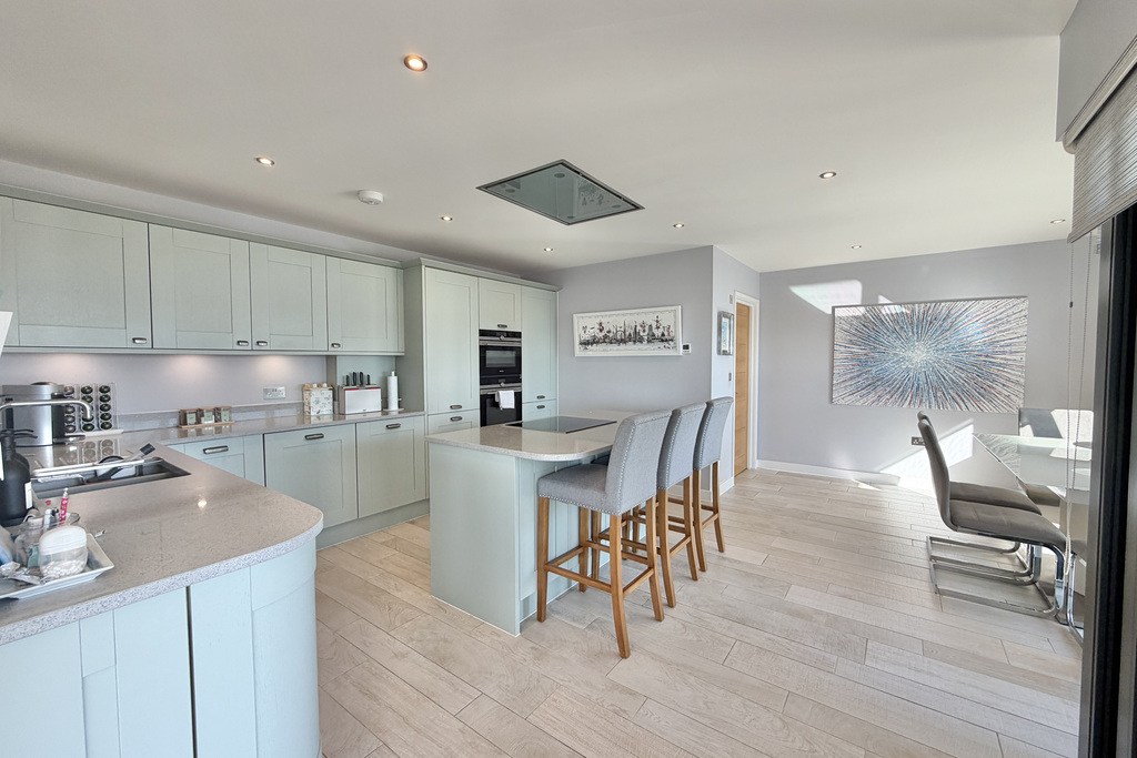 with wood effect tiled flooring, double glazed sliding doors leading out onto breakfast balcony, a selection of high and low level shaker style kitchen cabinets, stone worktops, inset two bowl composite sink, integrated Siemens dishwasher, integrated bin, Quooker instant boiling tap, integrated Siemens freezer, integrated tall Siemens fridge, integrated larder cupboard, integrated Siemens microwave oven, integrated Siemens fan assisted oven, freestanding island with stone worktop, Siemens induction with ceiling mounted extractor fan over, concealed power point