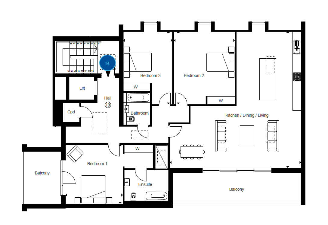 Apartment 13 is an exceptional penthouse residence offering luxurious coastal living with beautiful sea views. Step into a spacious hallway that sets the tone for the elegant interiors. The open-plan living and kitchen area—the true heart of the residence—boasts a large terrace showcasing the panoramic sea views. The elegant primary bedroom features a sleek en-suite shower room and direct access to a private balcony overlooking the sea. The second bedroom & third bedroom are generously sized offering versatility and comfort. Completing this remarkable home is a stylish main bathroom, thoughtfully designed with both a bath and shower for ultimate relaxation. A further premium feature of this penthouse is its direct lift access, providing both exclusivity and convenience.