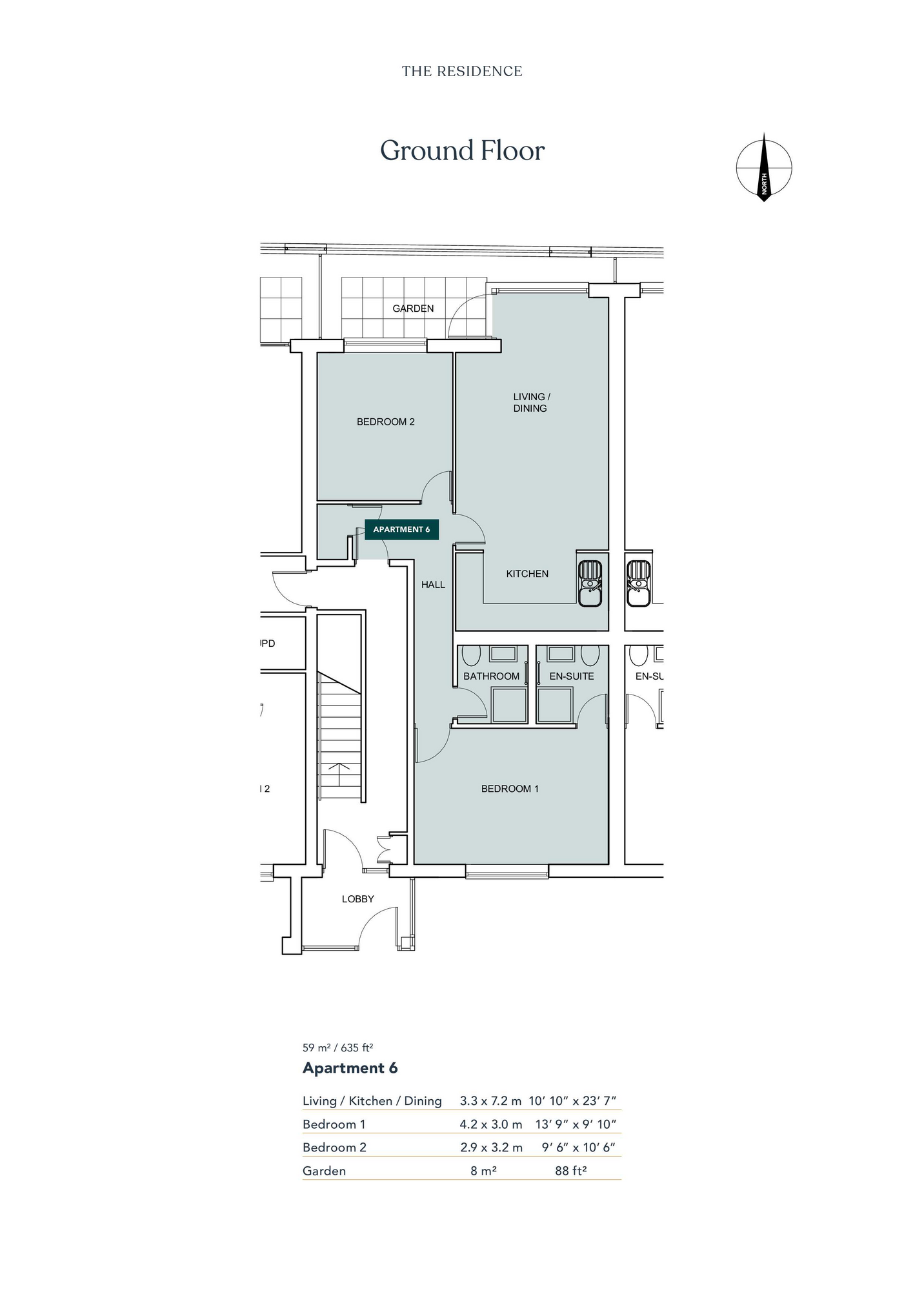 Apartment 6, a ground-floor apartment featuring an open-plan living room, kitchen, and dining area. This apartment includes a double bedroom with an en-suite shower room, a second double bedroom, a separate bathroom, and private terrace overlooking South Road recreation field.